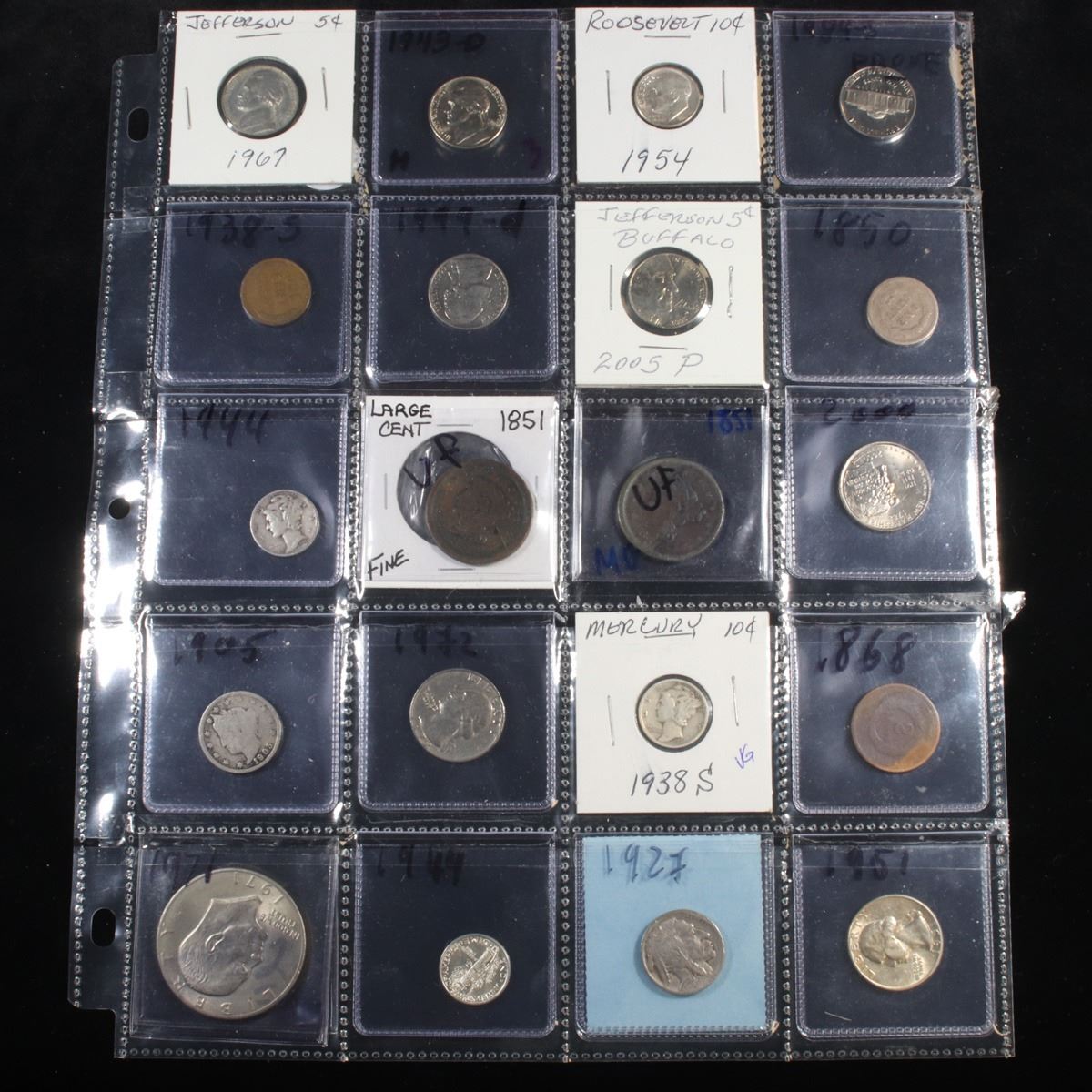 Page of 20 Mixed coins Mercury 10c, Braided Hair 1c, Washington 25c, Jefferson 5c, Indian 1c, Roosevelt 10c. A nice page of a wide variety of 20 coins. This page includes 1967-p Jefferson Nickel, 1943-d Jefferson Nickel, 1954-d Roosevelt dime, 1984-s Proof Jefferson nickel, 1938-s Lincoln cent, 1999-d Jefferson nickel, 2005-p Jefferson nickel, 1850 Indian cent, 1944-p Mercury dime, 1851 Braided Hair cent, 1851 Braided Hair cent, 2000-p Washington Quarter, 1905 Liberty Nickel, 1972-p Washington Quarter, 1938-s Mercury Dime, 1868 2c, 1971-p Eisenhower Dollar, 1944-p Mercury dime, 1927-p Buffalo Nickel, and 1951-p Washington Quarter.