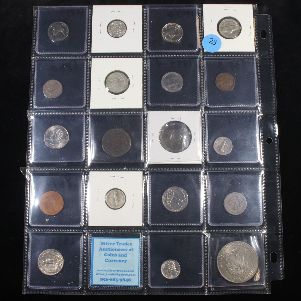 Page of 20 Mixed coins Mercury 10c, Braided Hair 1c, Washington 25c, Jefferson 5c, Indian 1c, Roosev