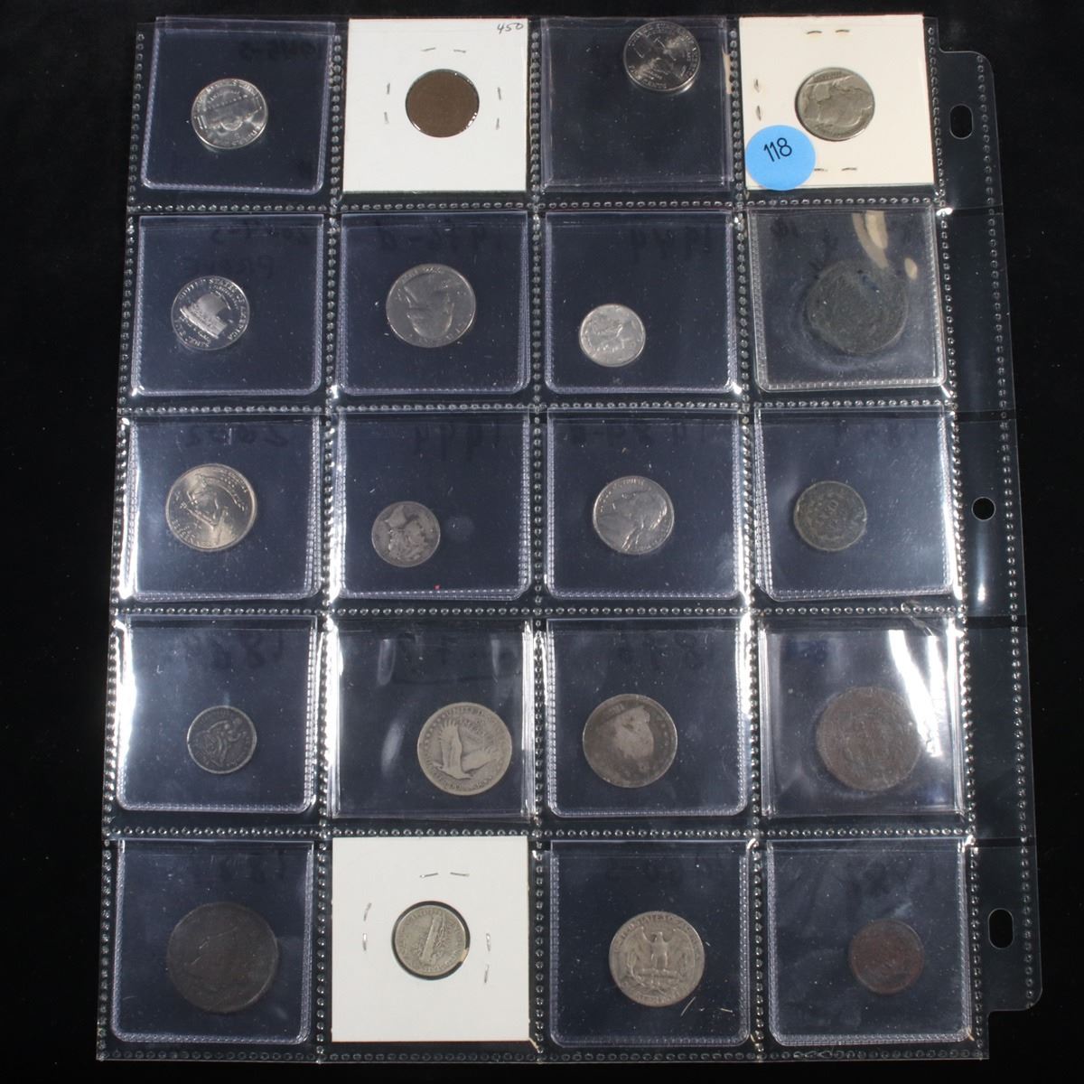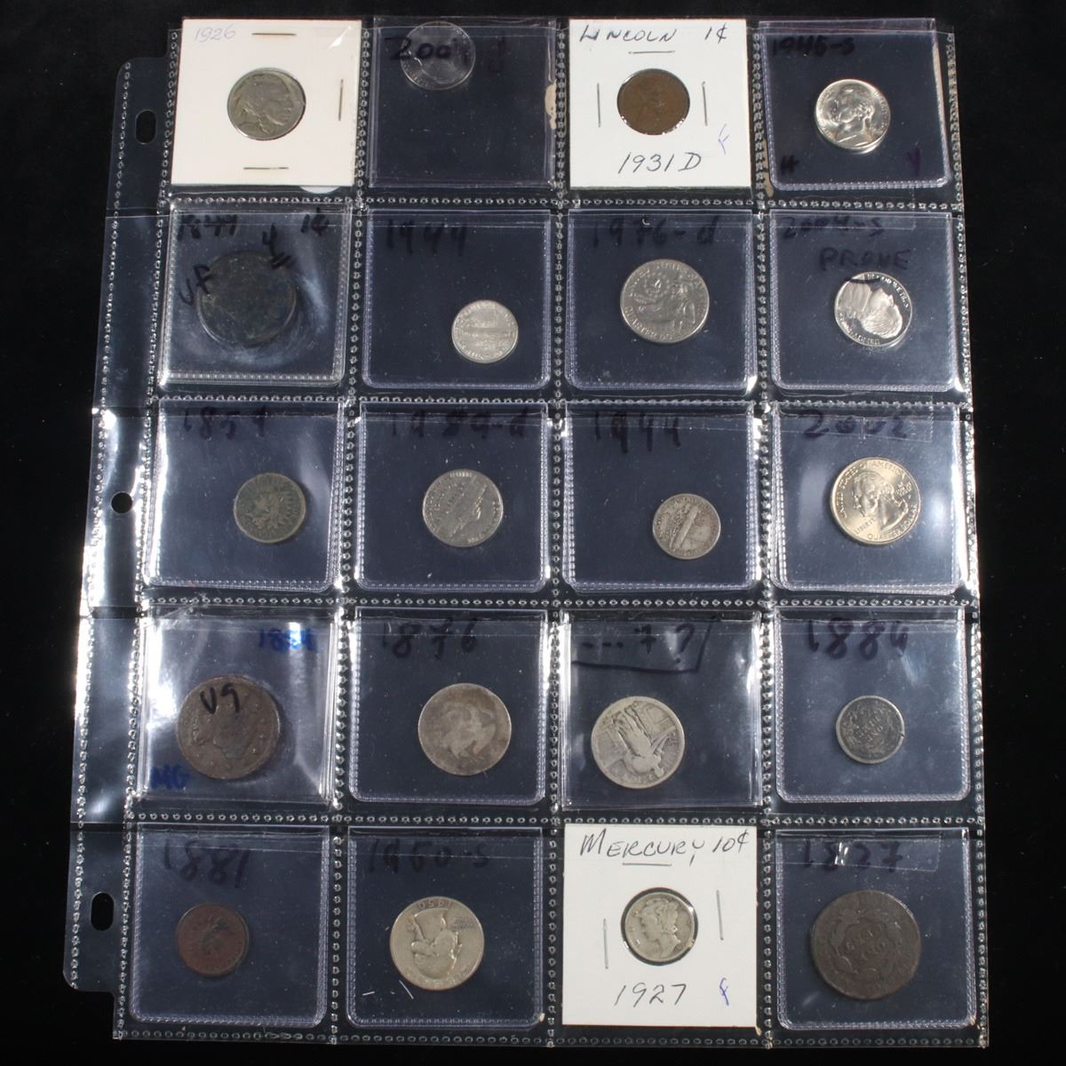 Page of 20 Mixed coins Mercury 10c, Braided Hair 1c, Washington 25c, Jefferson 5c, Indian 1c, Seated