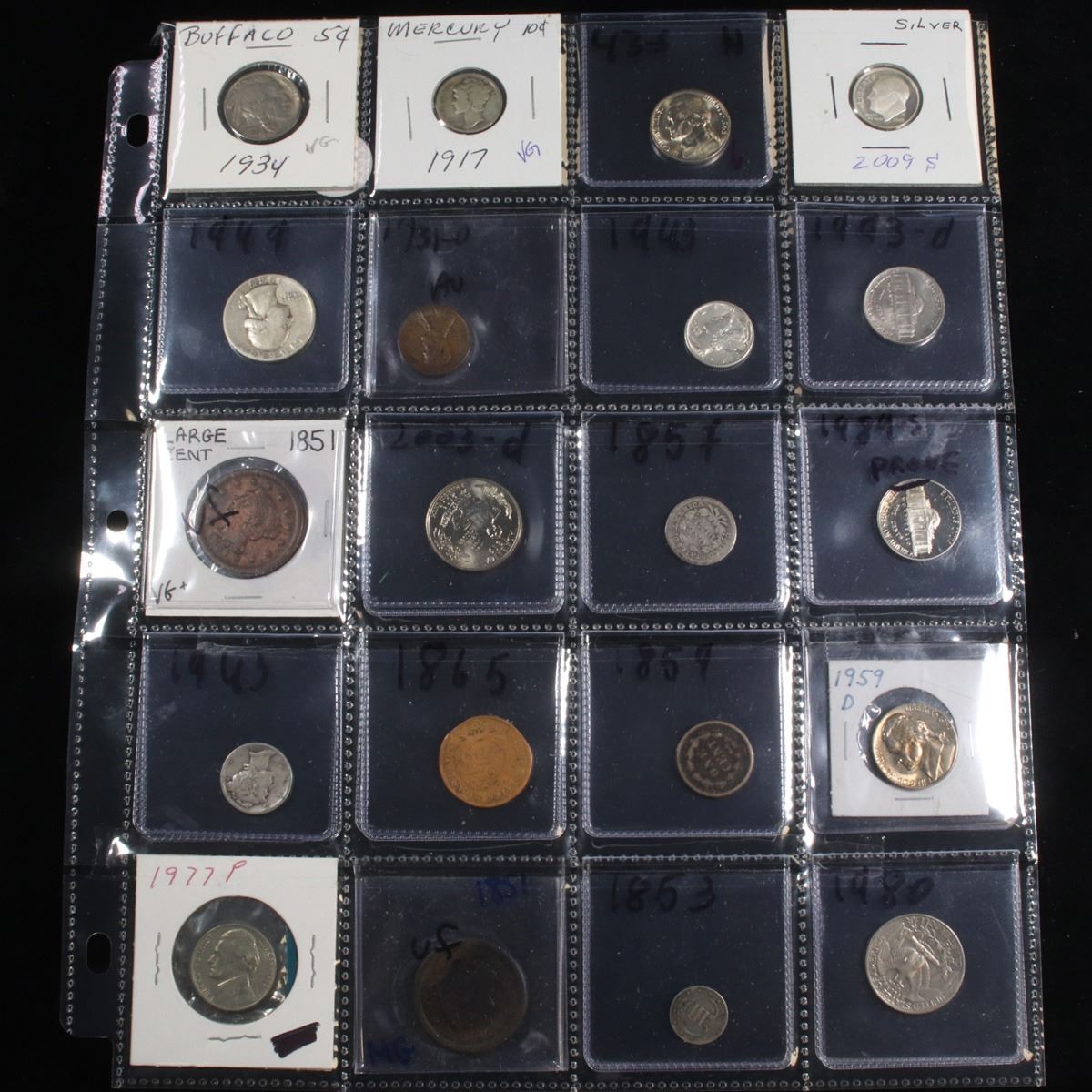 Page of 20 Mixed coins Mercury 10c, Braided Hair 1c, Washington 25c, Roosevelt 10c, Indian 1c, Jefferson 5c. A nice page of a wide variety of 20 coins. This page includes 1934-p Buffalo Nickel, 1917-p Mercury Dime, 1943-s Jefferson Nickel, 2009-s Roosevelt Dime, 1949-p Washington Quarter, 1913-d Lincoln Cent, 1943-p Mercury Dime, 1994-d Jefferson Nickel, 1851 Braided Hair Cent, 2003-d Washington Quarter, 1857-p Seated Liberty Dime, 1989-s Proof Jefferson Nickel, 1943-p Mercury Dime, 1865 2c, 1859 Indian Cent, 1959-d Jefferson Nickel, 1977-p Jefferson Nickel, 1851 Braided Hair cent, 1853 3cs, and 1980-p Washington Quarter