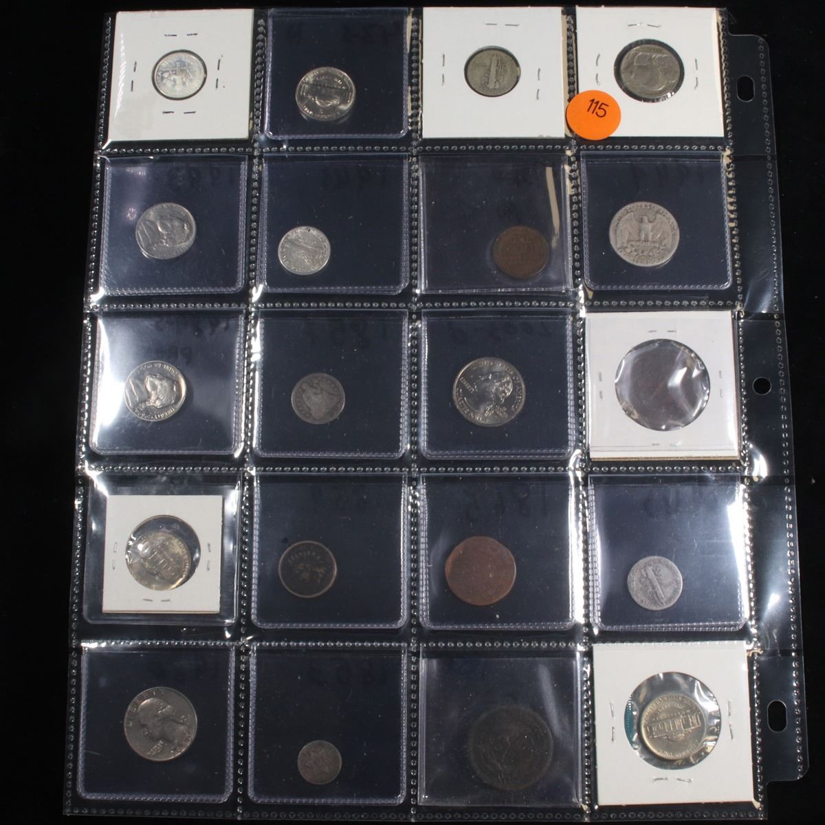 Page of 20 Mixed coins Mercury 10c, Braided Hair 1c, Washington 25c, Roosevelt 10c, Indian 1c, Jeffe