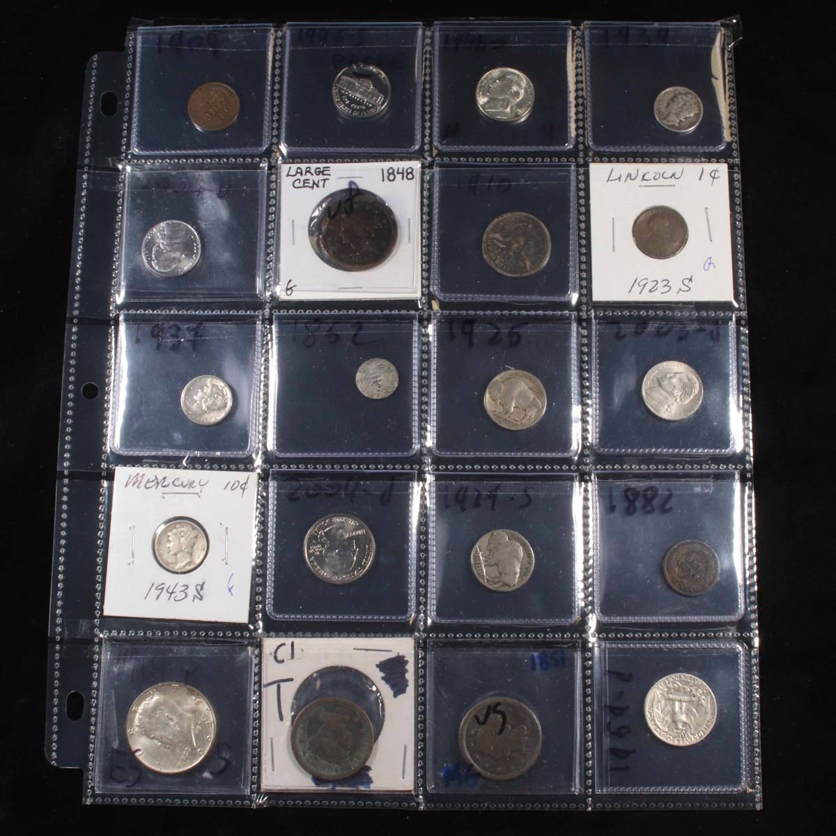 Page of 20 Mixed coins Mercury 10c, Braided Hair 1c, Washington 25c, Roosevelt 10c, Indian 1c, Jefferson 5c. A nice page of a wide variety of 20 coins. This page includes 1909-p Lincoln Cent, 1997-s Proof Jefferson Nickel, 1945-s Jefferson Nickel, 1939-p Mercury Dime, 2004-d Jefferson Nickel, 1848 Braided Hair Cent, 1910-p Barber Quarter, 1923-s Lincoln Cent, 1937-p Mercury Dime, 1852 3cs, 1925-p Buffalo Nickel, 2003-d Jefferson Nickel, 1943-s Mercury Dime, 2004-d Washington Quarter. 1929-s Buffalo Nickel, 1882 Indian cent, 1964-p Kennedy Half, No Date Large Cent, 1851 Braided Hair cent, and a 1959-d Washington Quarter