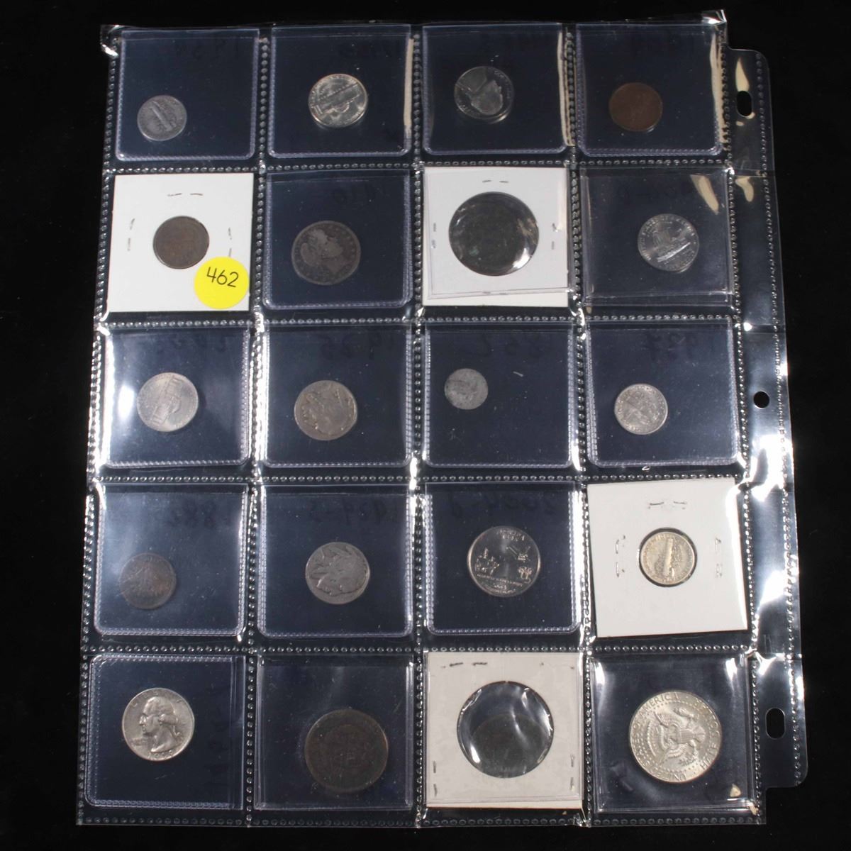 Page of 20 Mixed coins Mercury 10c, Braided Hair 1c, Washington 25c, Roosevelt 10c, Indian 1c, Jeffe