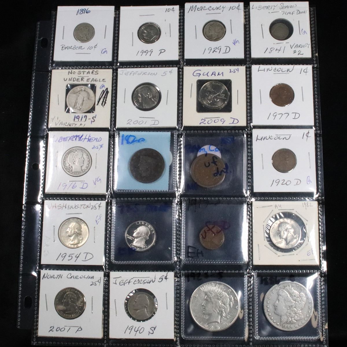 Page of 20 Mixed coins Morgan $1, Peace $1, Proof Washington 25c, Barber 10c, Jefferson5c . .. A nice page of a wide variety of 20 coins. This page includes 1886-o Morgan, 1925-s Peace Dollar, 1940-s Jefferson, 2001-p North Carolina Washington 25c, 1954-d Washington 25c, 1977-s Proof Washington 25c, 1917-d Lincoln Cent, 1982-p Washington 25c, 1916-d Barber 25c, 1820 Coronet Head cent, 1854 Braided Hair Cent, 1920-d Lincoln cent , 1917-s Standing Liberty 25c, 2001-d Jefferson Nickel, 2009-d Guam Washington 25c, 1977-d Lincoln cent ,1896-p Barber 10c, 1929-d Mercury Dime, 1999-p Roosevelt Dime, and a 1841-p Seated Liberty 1/2 10c