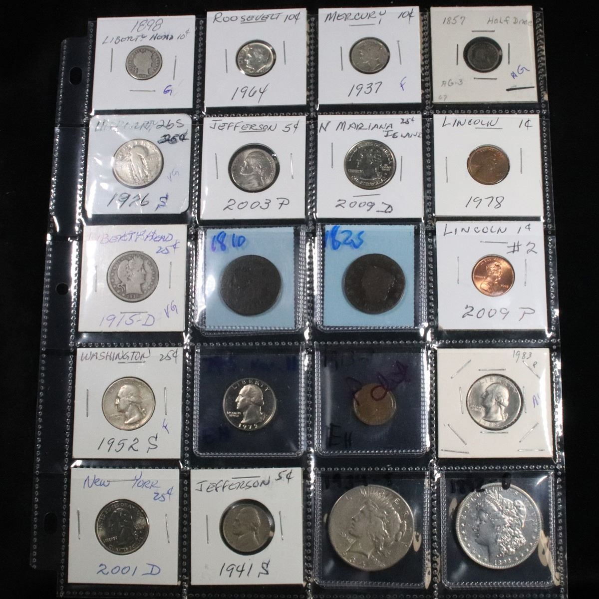 Page of 20 Mixed coins Morgan $1, Peace $1, Proof Washington 25c, Barber 10c, Jefferson5c . .. A nice page of a wide variety of 20 coins. This page includes 1892-o Morgan, 1934-s Peace Dollar, 1941-s Jefferson, 2001-d New York Washington 25c, 1952-d Washington 25c, 1979-s Type 2 Proof Washington 25c, 1913-p Lincoln Cent, 1983-p Washington 25c, 1915-d Barber 25c, 1810 Classic Head cent, 1825 Coronet Head Cent, 2009-p Lincoln cent , 1926-s Standing Liberty 25c, 2003-p Jefferson Nickel, 2009-d N Mariana Island Washington 25c, 1978-p Lincoln cent ,1898-p Barber 10c, 1937-s Mercury Dime, 1964-p Roosevelt Dime, and a 1857-p Seated Liberty 1/2 10c