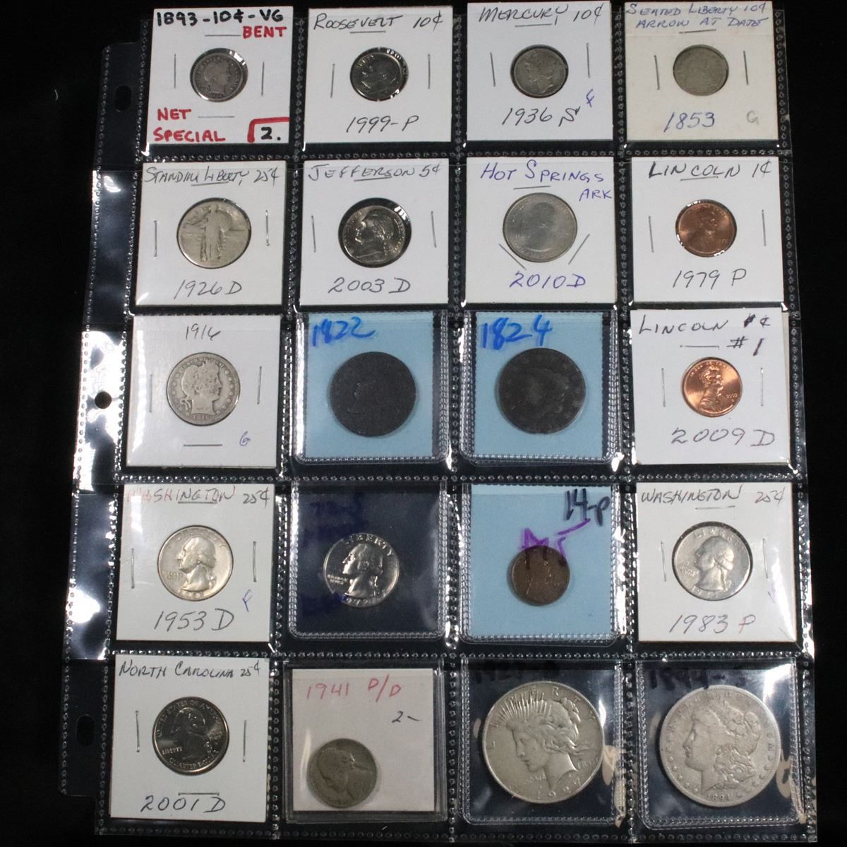Page of 20 Mixed coins Morgan $1, Peace $1, Proof Washington 25c, Barber 10c, Jefferson5c . .. A nice page of a wide variety of 20 coins. This page includes 1894-s Morgan, 1927-d Peace Dollar, 1941-d/d Jefferson, 2001-d North Carolina Washington 25c, 1953-d Washington 25c, 1972-s Proof Washington 25c, 1914-p Lincoln Cent, 1983-p Washington 25c, 1916-p Barber 25c, 1822 Coronet Head cent, 1824 Coronet Head Cent, 2009-d Lincoln cent , 1926-d Standing Liberty 25c, 2003-d Jefferson Nickel, 2010-d Hot Springs Washington 25c, 1979-p Lincoln cent ,1893-p Barber 10c, 1936-s Mercury Dime, 1999-p Roosevelt Dime, and a 1853-p Seated Liberty 10c (Arrows At Date)
