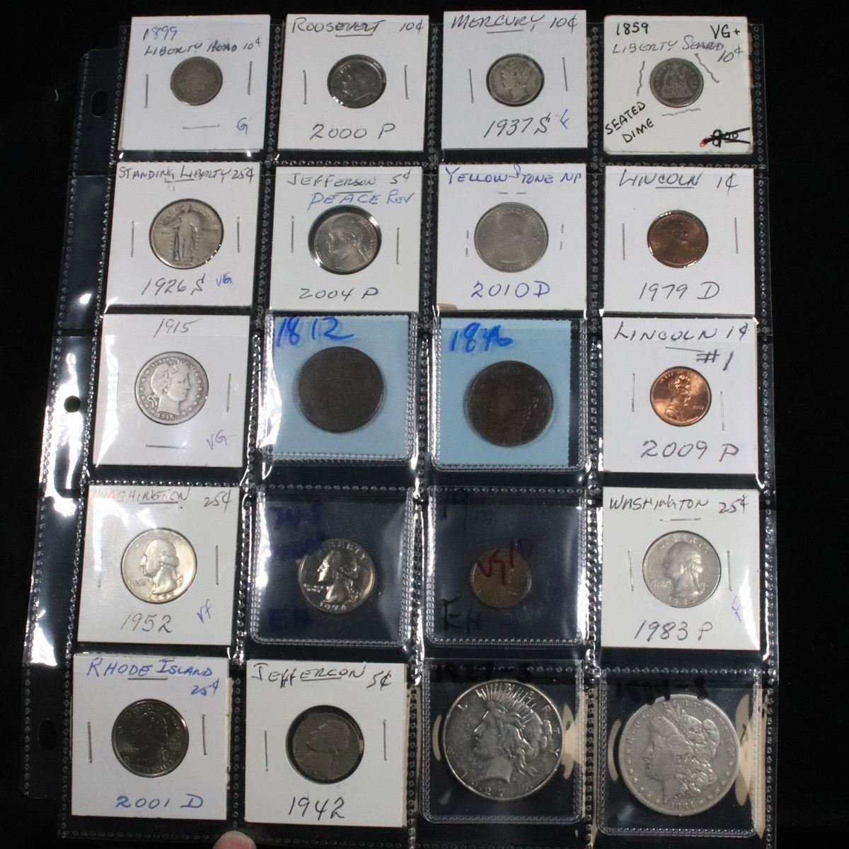 Page of 20 Mixed coins Morgan $1, Peace $1, Proof Washington 25c, Barber 10c, Jefferson5c . .. A nice page of a wide variety of 20 coins. This page includes 1884-sMorgan, 1927-s Peace Dollar, 1942-p Jefferson, 2001-d Rhode Island Washington 25c, 1952-p Washington 25c, 1974-s Proof Washington 25c, 1916-p Lincoln Cent, 1983-p Washington 25c, 1915-p Barber 25c, 1812 Coronet Head cent, 1846 Braided Hair Cent, 2009-p Lincoln cent , 1926-s Standing Liberty 25c, 2004-p Peace rev Jefferson Nickel, 2010-d Yellowstone Washington 25c, 1979-d Lincoln cent ,1899-p Liberty 10c, 1937-s Mercury Dime, 2000-p Roosevelt Dime, and a 1859-p Seated Liberty 10c