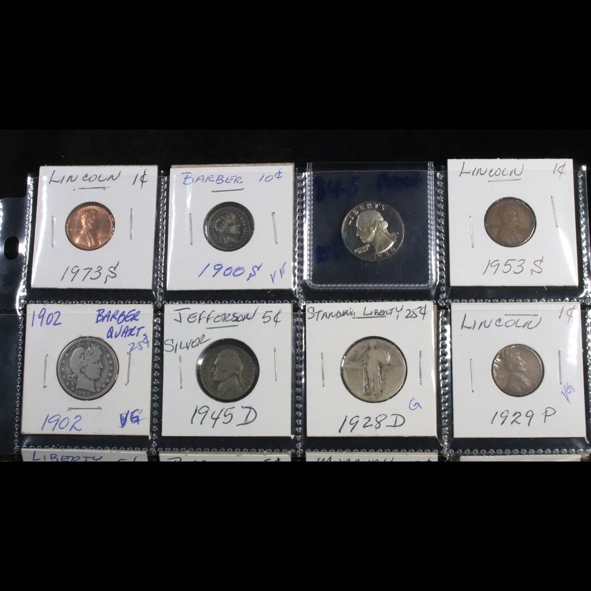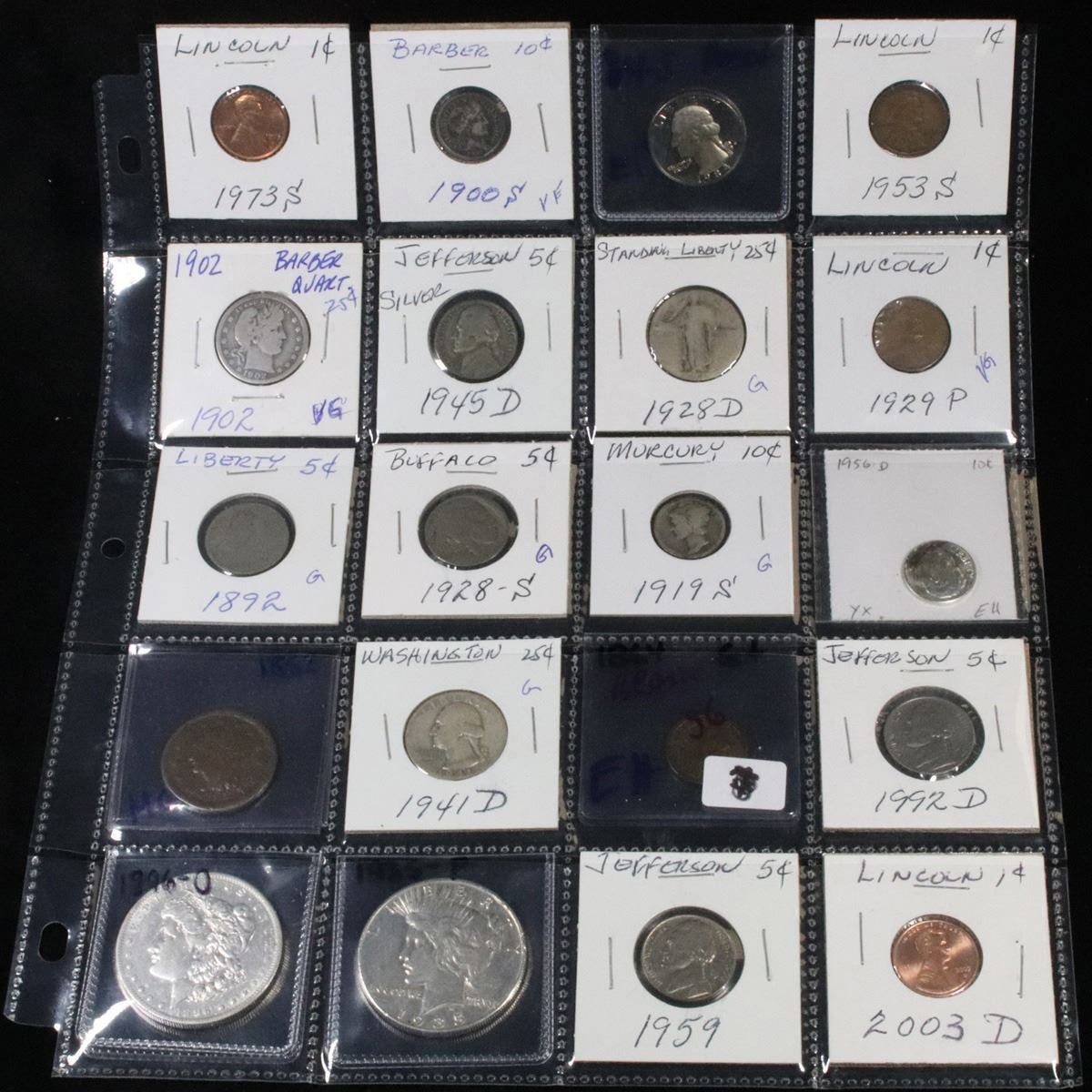 Page of 20 Mixed coins Morgan $1, Peace $1, Proof Washington 25c, Barber 5c, Indian 1c, Buffalo 5c