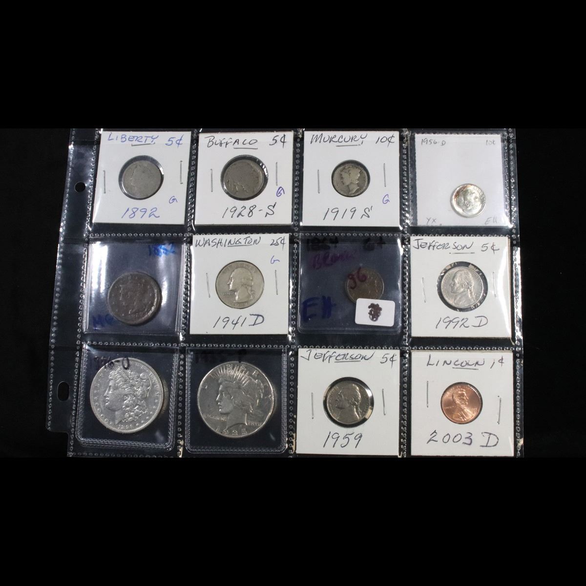 Page of 20 Mixed coins Morgan $1, Peace $1, Proof Washington 25c, Barber 5c, Indian 1c, Buffalo 5c . .. A nice page of a wide variety of 20 coins. This page includes 1896-o Morgan, 1935-p Peace Dollar, 1959-p Jefferson Nickel, 2003-d Lincoln Cent, 1852 Braided Hair, 1941-d Washington Quarter, 1864 Bronze Indian Cent, 1992-d Jefferson Nickel, 1892 Liberty Nickel, 1928-s Buffalo Nickel, 1919-s Mercury Dime, 1956-d Roosevelt Dime, 1902-p Barber 25c, 1945-d Jefferson, 1928-d Standing Liberty Quarter,1929-p Lincoln, 1973-s Lincoln, 1900-s Barber Dime, 1984-s Proof Washington Quarter, and a 1953-s Lincoln cent.