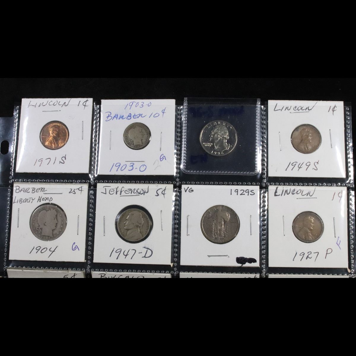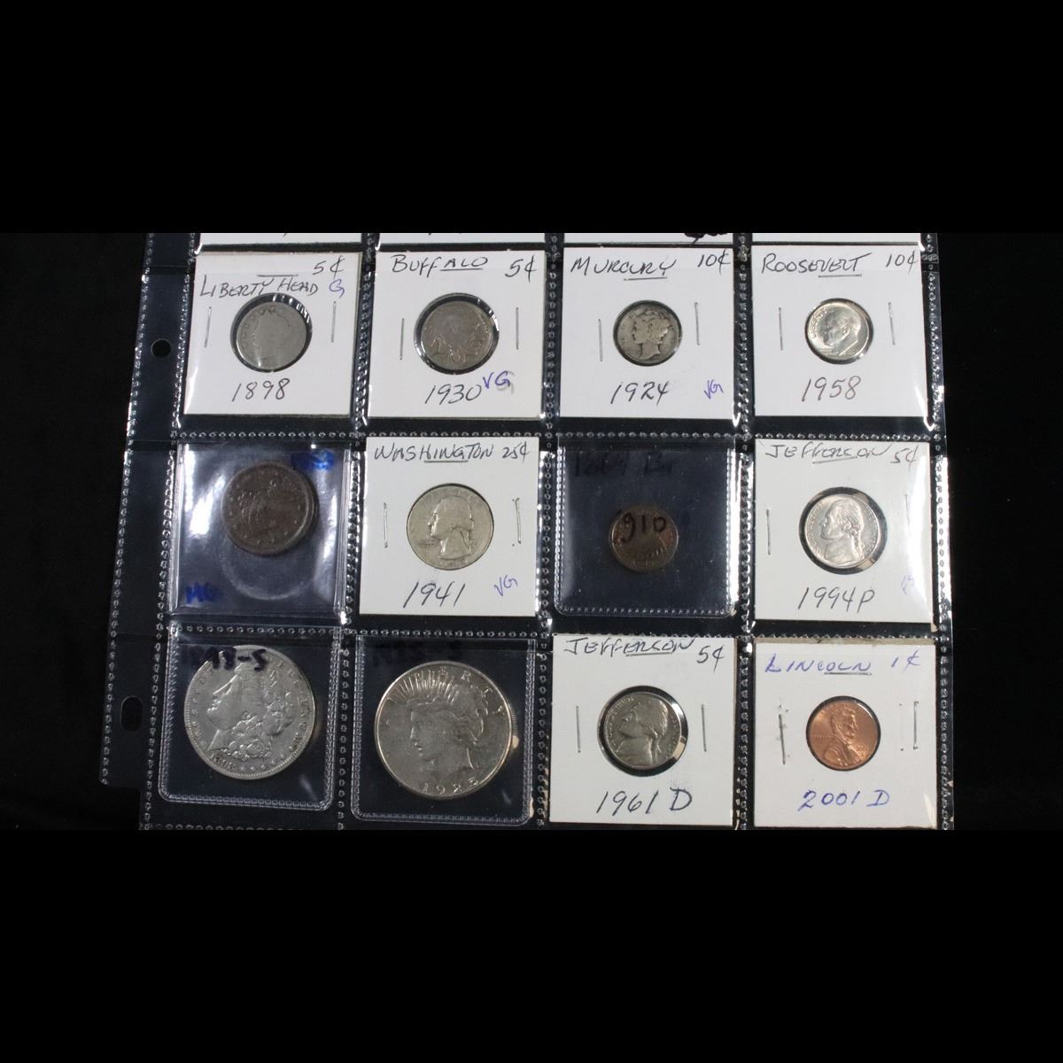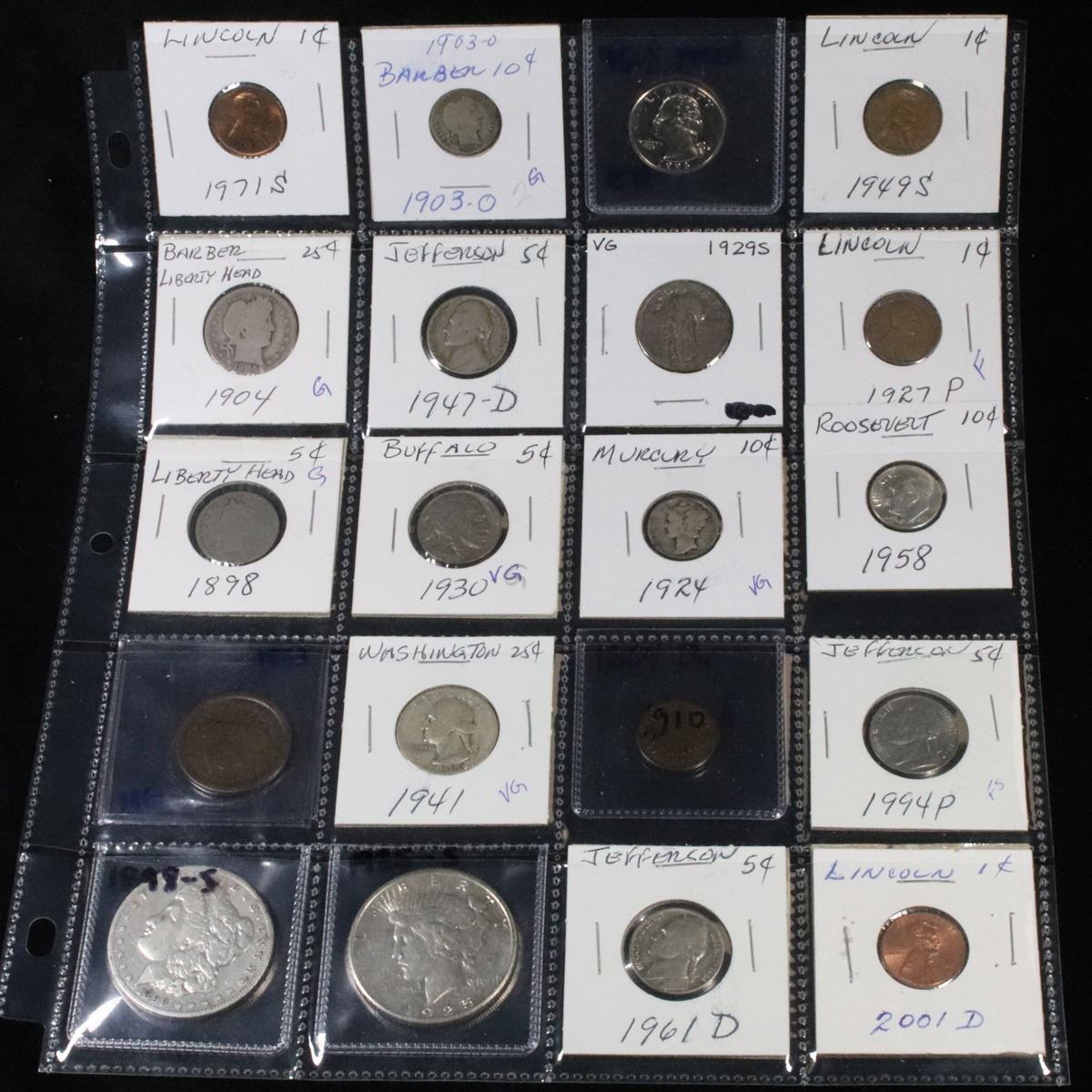 Page of 20 Mixed coins Morgan $1, Peace $1, Standing Liberty 25c, Barber 10c, Indian 1c, Buffalo 5c . .. A nice page of a wide variety of 20 coins. This page includes 1898-s Morgan, 1925-s Peace Dollar, 1961-d Jefferson Nickel, 2001-d Lincoln Cent, 1853 Braided Hair, 1941-p Washington Quarter, 1864 Bronze Indian Cent, 1994-p Jefferson Nickel, 1898 Liberty Nickel, 1930-p Buffalo Nickel, 1924-p Mercury 10c, 1958-p Roosevelt Dime, 1904 Barber 25c, 1947-d Jefferson, 1929-s Standing Liberty Quarter,1927-p Lincoln, 1971-s Lincoln, 1903-o Barber Dime, 1996-s Proof Washington Quarter, and a 1949-s Lincoln cent.