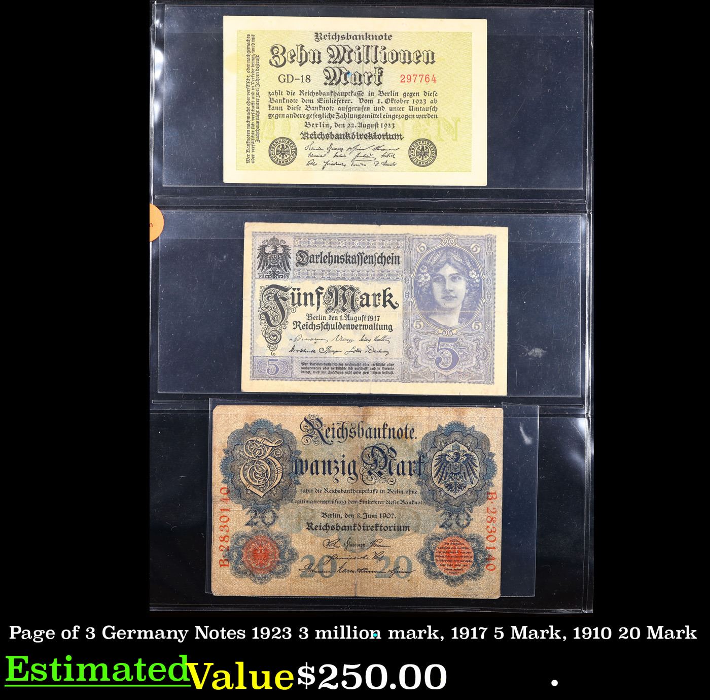 Page of 3 Germany Notes 1923 3 million mark, 1917 5 Mark, 1910 20 Mark
