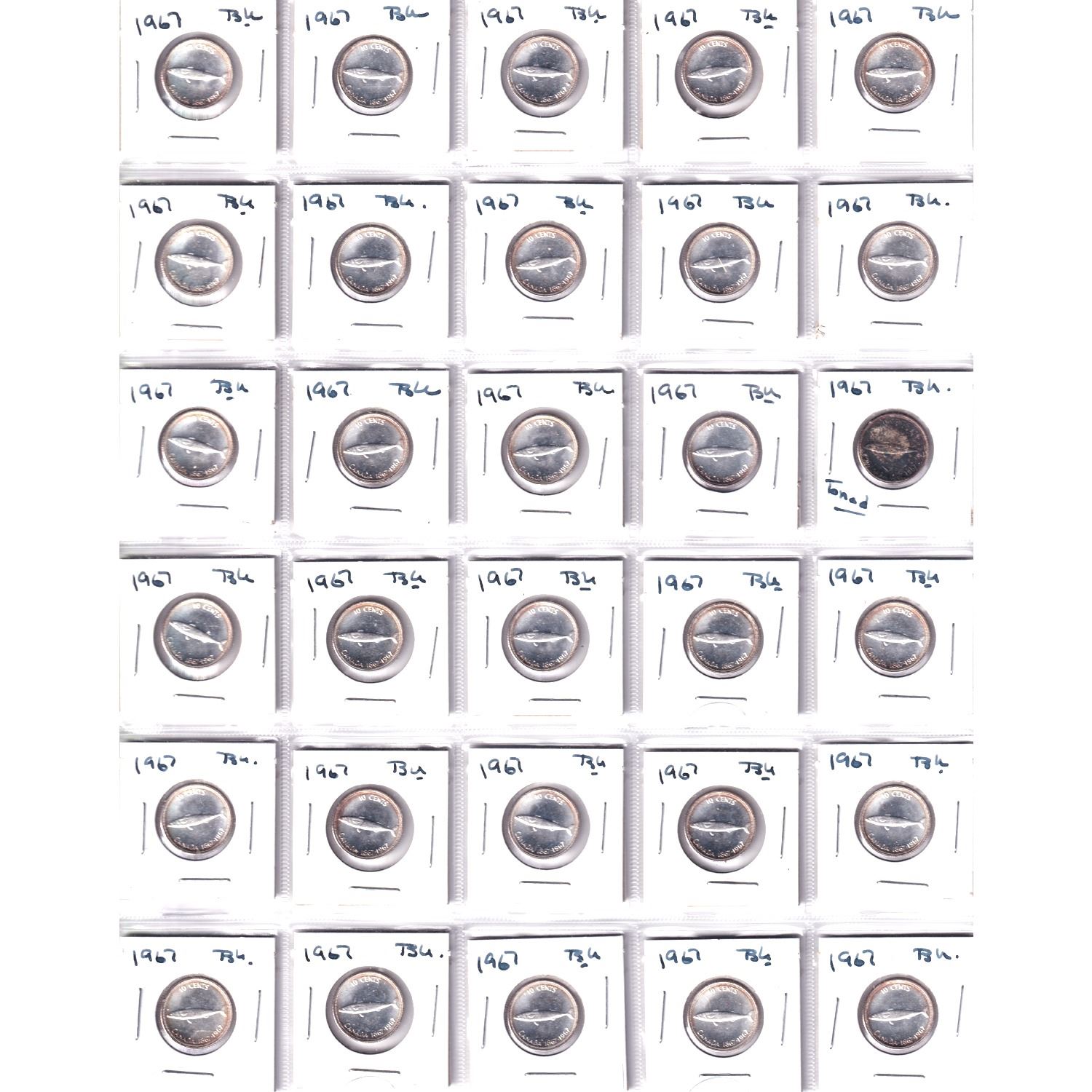 Page of 30x 1967 Canada Silver 10-cents.coins appear to be in BU Condition. 30pcs