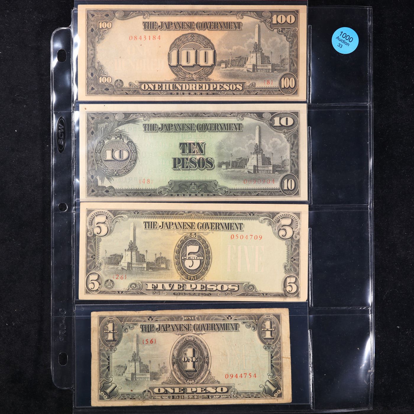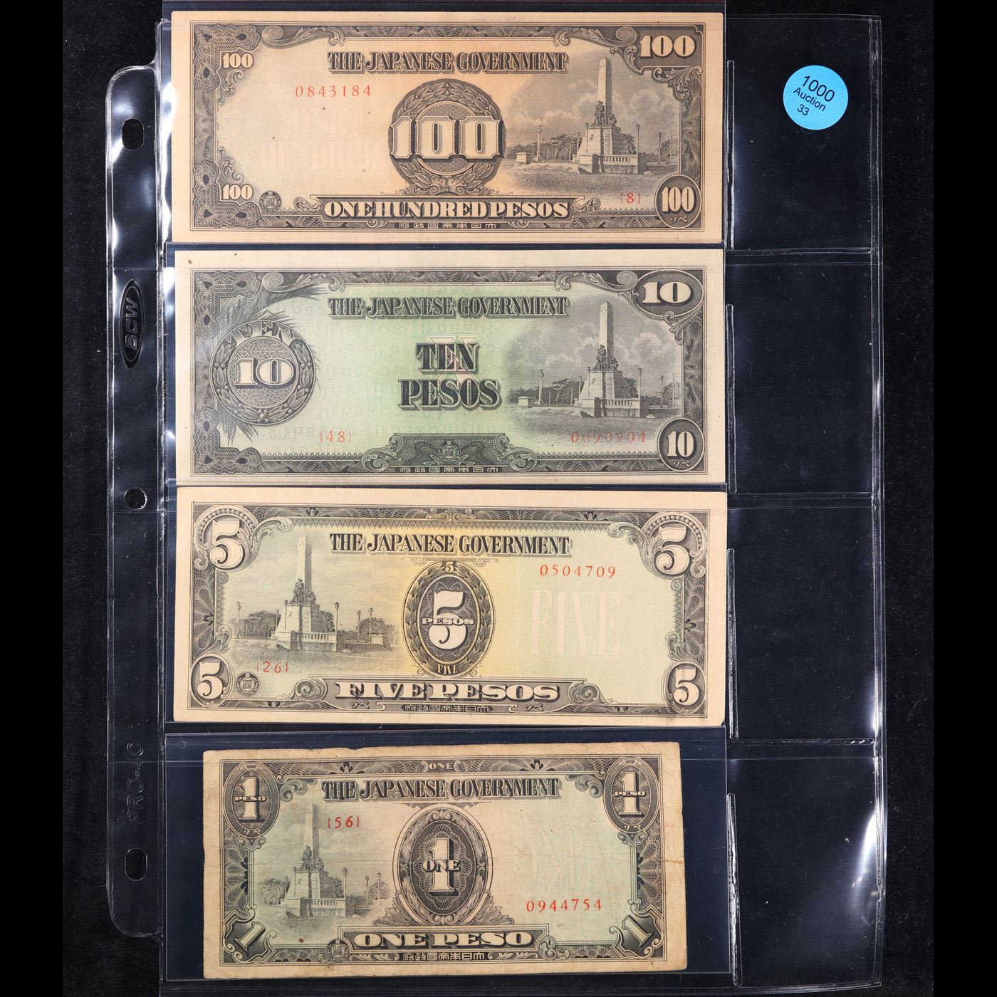 Page of 4 1940's Philippines Japanese WWII Occupation (JIM) 1 Peso, 5 Peso, 10 Peso, 100 Peso XF/AU