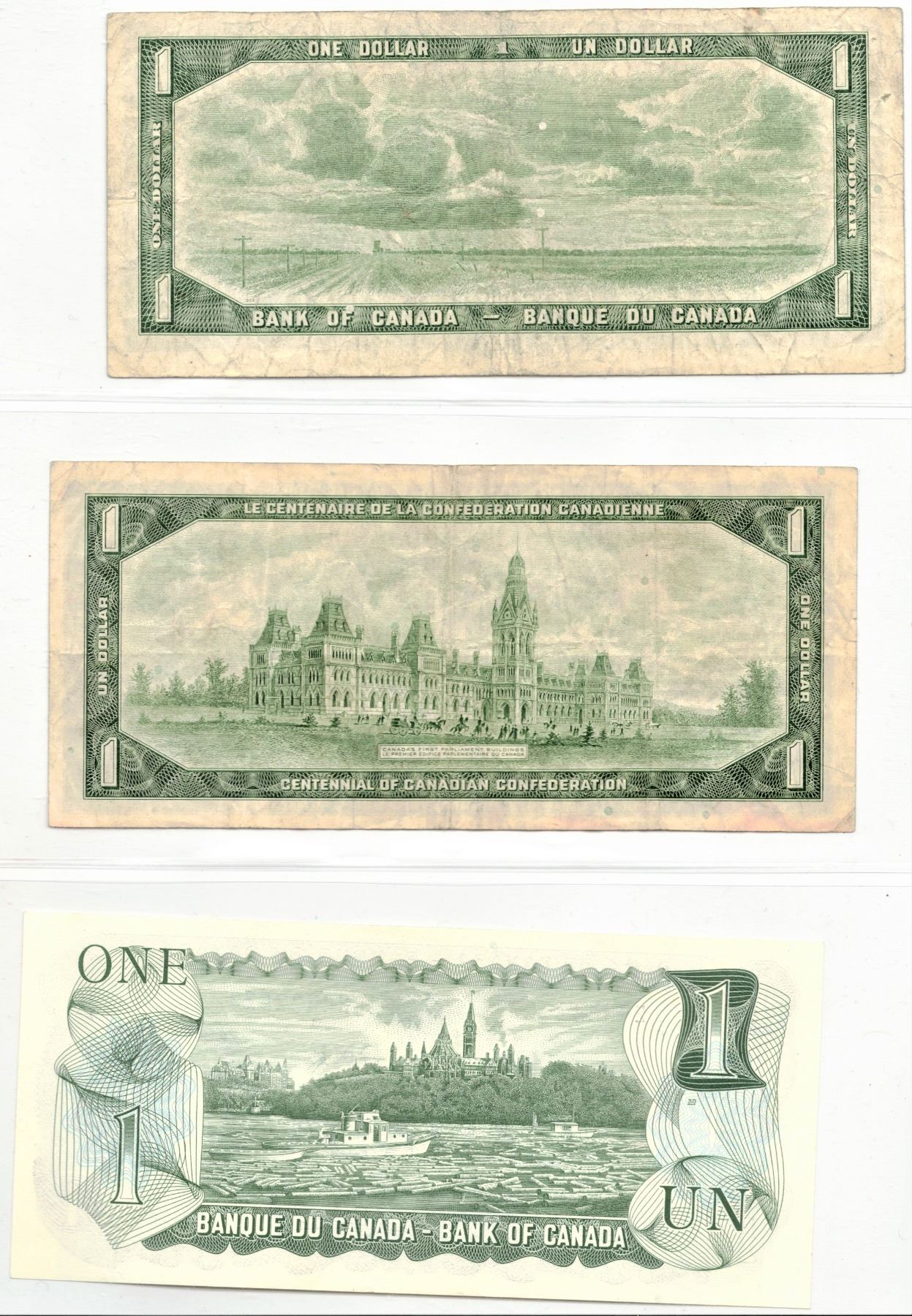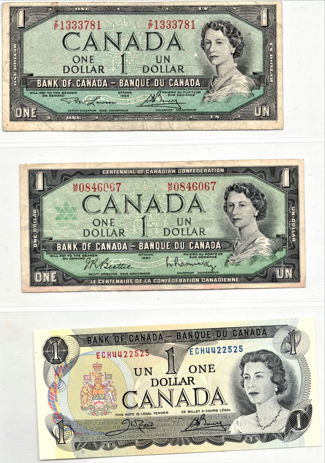 Page of Three Canadian Bank Notes - 1954 One Dollar Bill, 1967 One Dollar Bill, 1973 One Dollar Bill