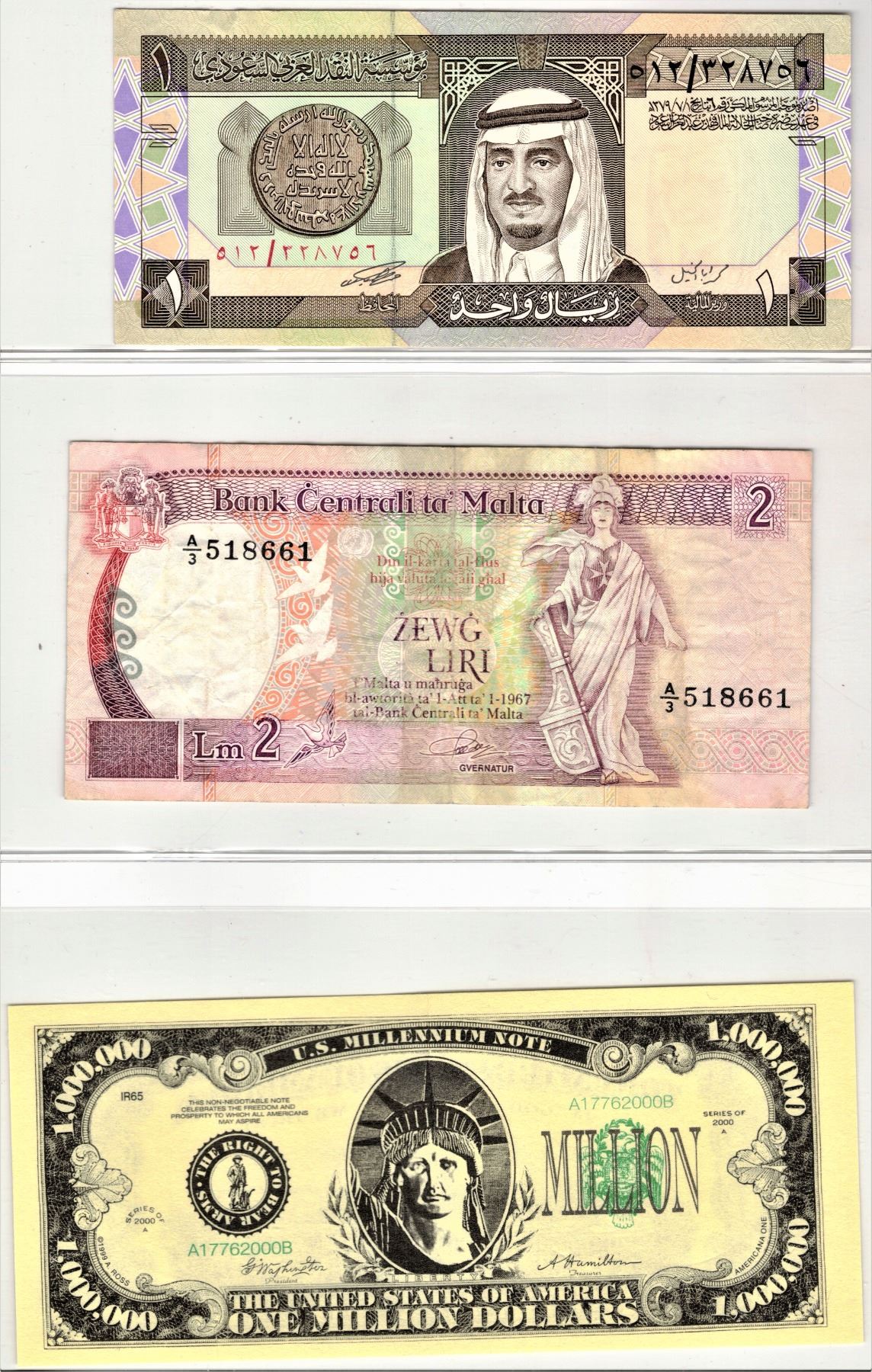 Page of Three Foreign Bank Notes - USA "One Million" Dollar Bill, Bank of Malta, Saudi Arabia