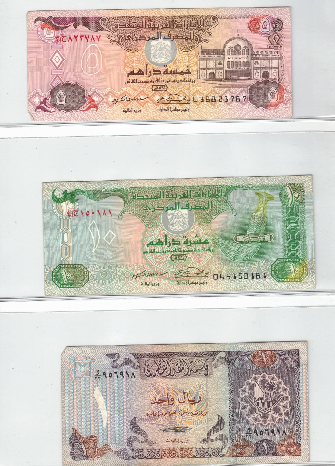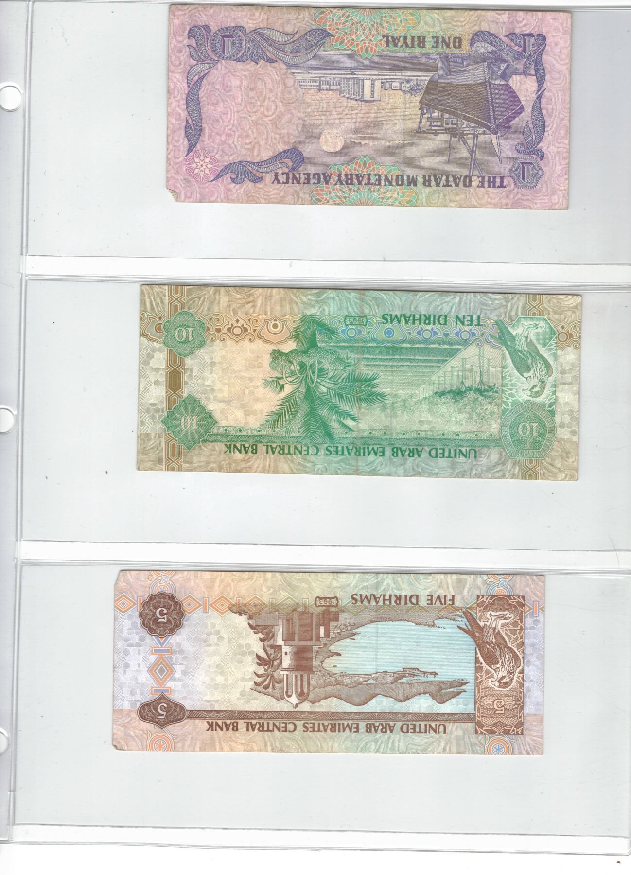 Page of Three Foreign Bank Notes - United Arab Emirates and Qatar