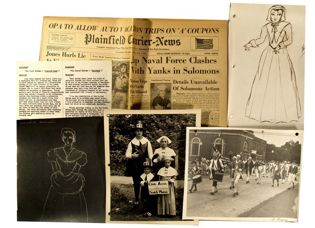 A blue three ring notebook with letters and notes to Peter Payne. According to the letters, Payne and his committee (Members of the Fanwood Presbyterian Church and anyone else who wished to participate) had a pageant performance called "For God and Country" which was held on July 4th 1943. Other letters commending his work called it "...tableaux at the Scotch Plains - Fanwood Patriotic Rally..." On some pages there are cut-out and glued down columns from newspapers about the performance. Also included are photos cut out of newspapers of children dressed as pilgrims, a civil war scene reenactment and others. A red, white, and blue program flyer is also inside, followed by a program booklet. Original photos by R. Mitchell, and A. Mingione. Stage designs, costume sketches, and pages of lists with directors, cast members and even scripts of "play" are scattered throughout. One July 6th 1943 Plainfield Courier-News newspaper, carried a full page of the event with pictures on page 8. Scrapbook, copies of sketches, and scenes all together inside of a black and white stationery box. Good condition.City: PlainfieldCounty: UnionState: NJ