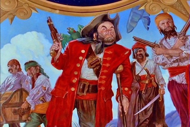 Pagemaster Original Pirate Rotunda Dome Ceiling Painting Set Piece - From the beloved all star live-action/animation fantasy feature “The Pagemaster” (1994) comes this once-in-a-lifetime piece of movie history. An amazing mammoth-size section of the actual mind-blowing screen-used fully painted magical rotunda dome set. It is seen to great extent at the beginning of the film when Richard (Macaulay Culkin) runs through Mr. Dewey/ The Pagemaster's (Christopher Lloyd) library and confronts this dome in the center of the building, that has, painted on its ceiling, like the Sistine Chapel, the four classic story themes: Fantasy, Horror, Adventure and Heroics. The is the Adventure section (lead by Patrick Stewart), showing famous Pirate Long John Silver on his ship, the Hispaniola, along with his skullduggery crew. The stunning panoramic paintings were created by legendary Award-Winning International Artist/Illustrator Chris Hopkins, known for his work on such epics as "Indiana Jones and the Temple of Doom", and "Star Wars - Return of the Jedi". He was specially selected by producer David Kirschner for this monumental job. Hopkins created these super-sized tableau life-like creations utilizing special oils, to invoke the feeling of classic children book illustrations seen through a child's imagination, as well as their dreams and fears. Each section is sold separately, but if one buyer collects the full set, they will also receive the additional rotunda connecting set pieces to re-create the dome. Mr. Hopkins will also personally signed each section to the buyer. Because of its size, please allow for in-studio pick-up or third-party shipping. Pirate section is approx 58"x58".