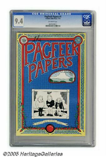 <B>Pagfeek Papers #1 (Kitchen Sink, 1973) CGC NM 9.4 Off-white pages.</B></I> Oddball Underground by artist Mark Morrison. Original print run of 10,000 copies. CGC census, 3/05: 1 in 9.4, none higher.