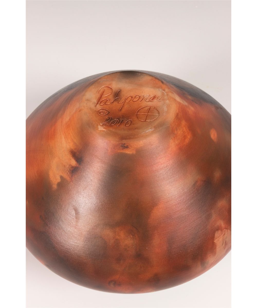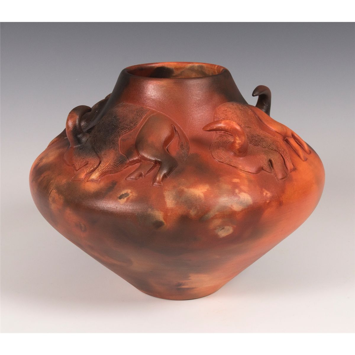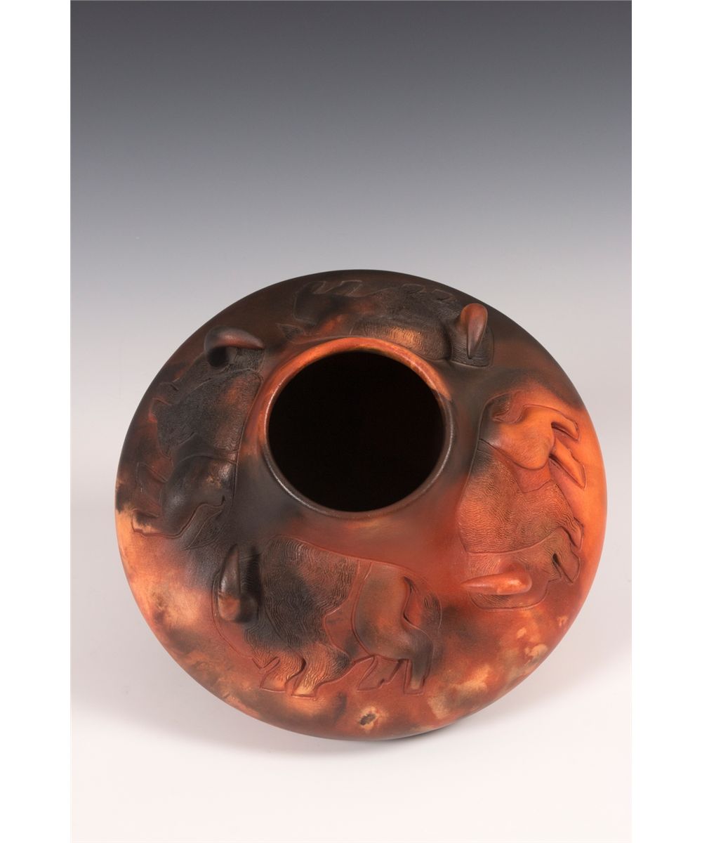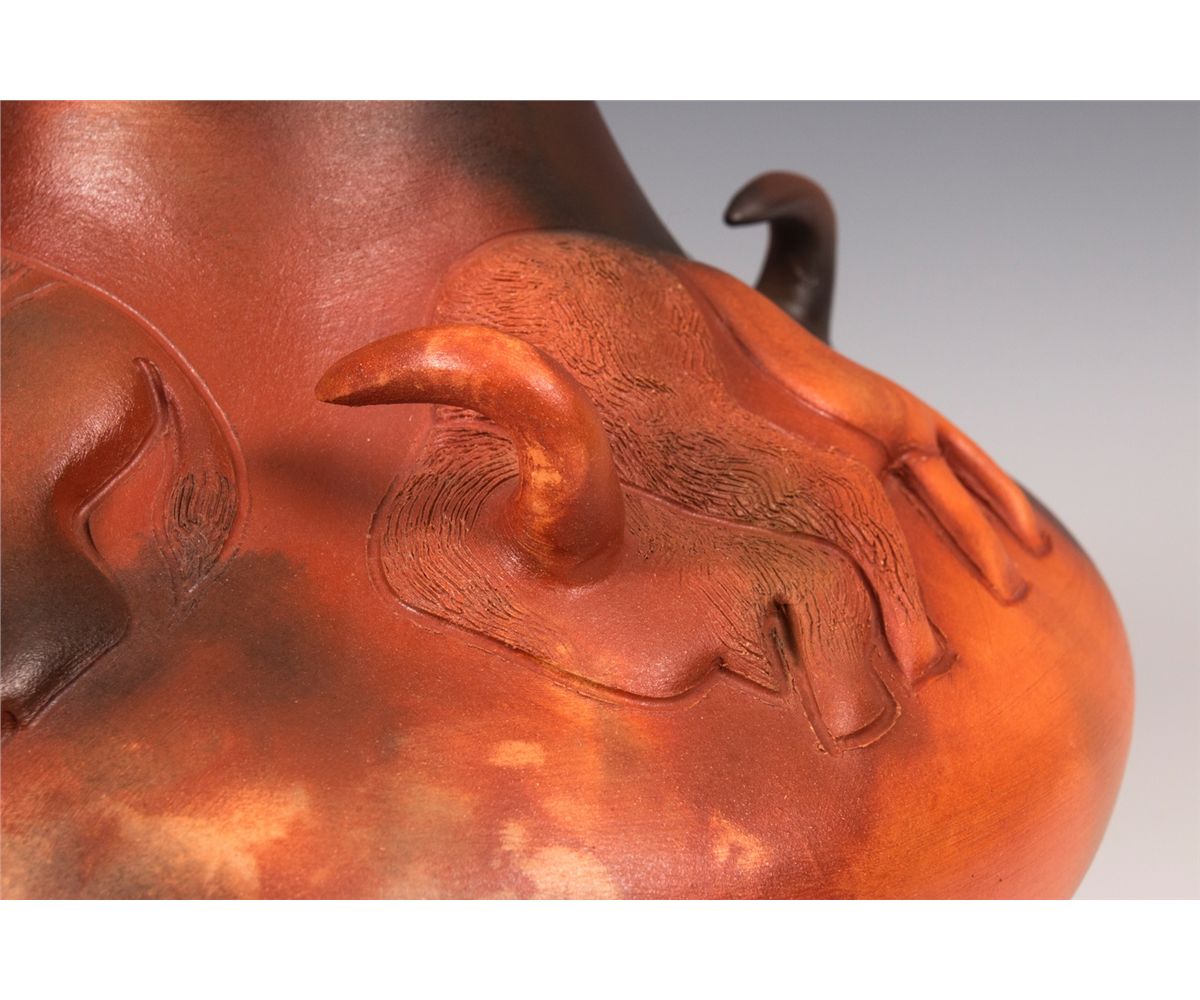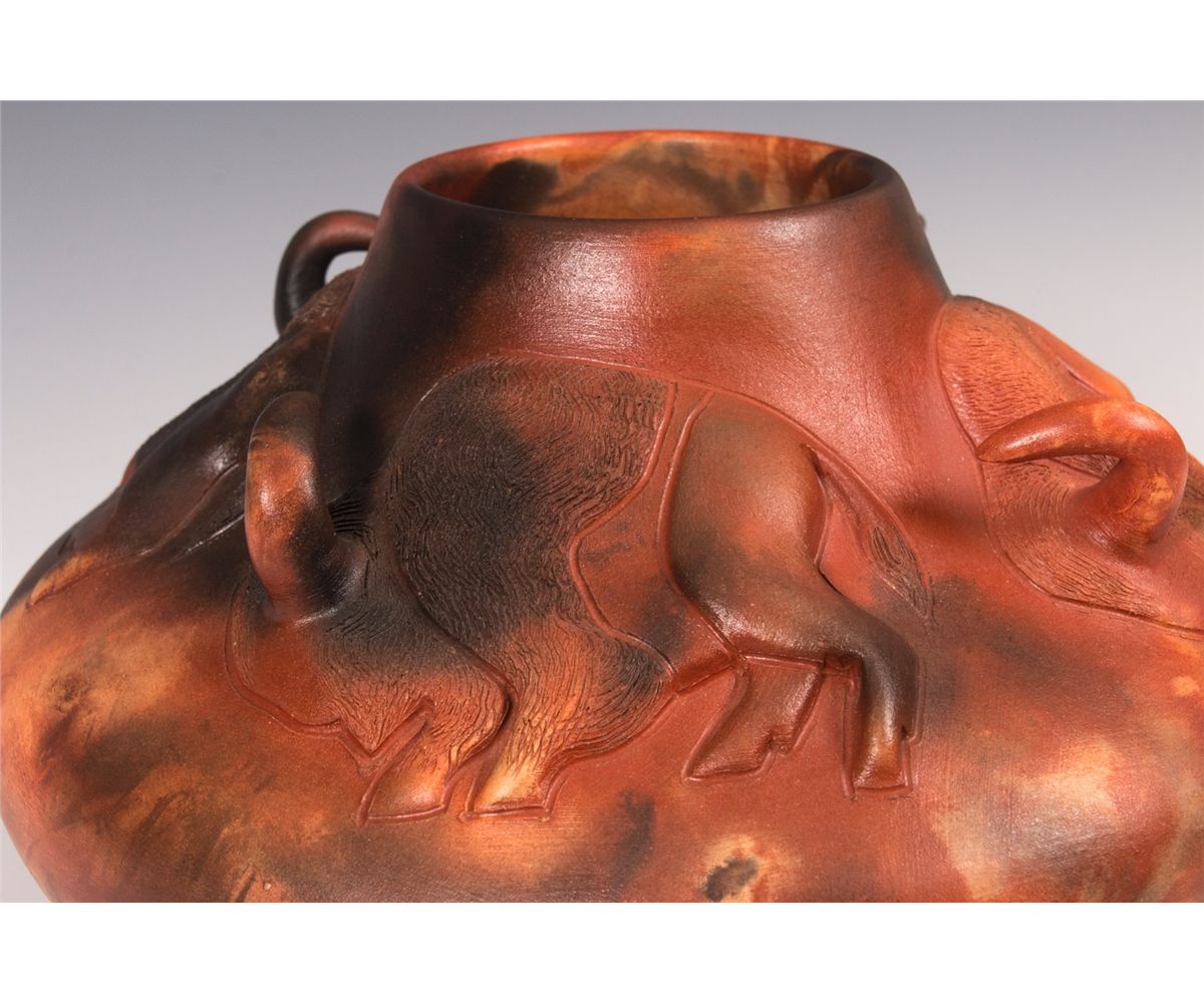 Pahponee (Kickapoo & Potawatomi). 8" tall, 9" diameter. Clay jar decorated with a band of four bison, each with an extruding horn. Signed on base: Pahponee © 2010. Provenance: Estate of Ken Holm, Denver, CO.
