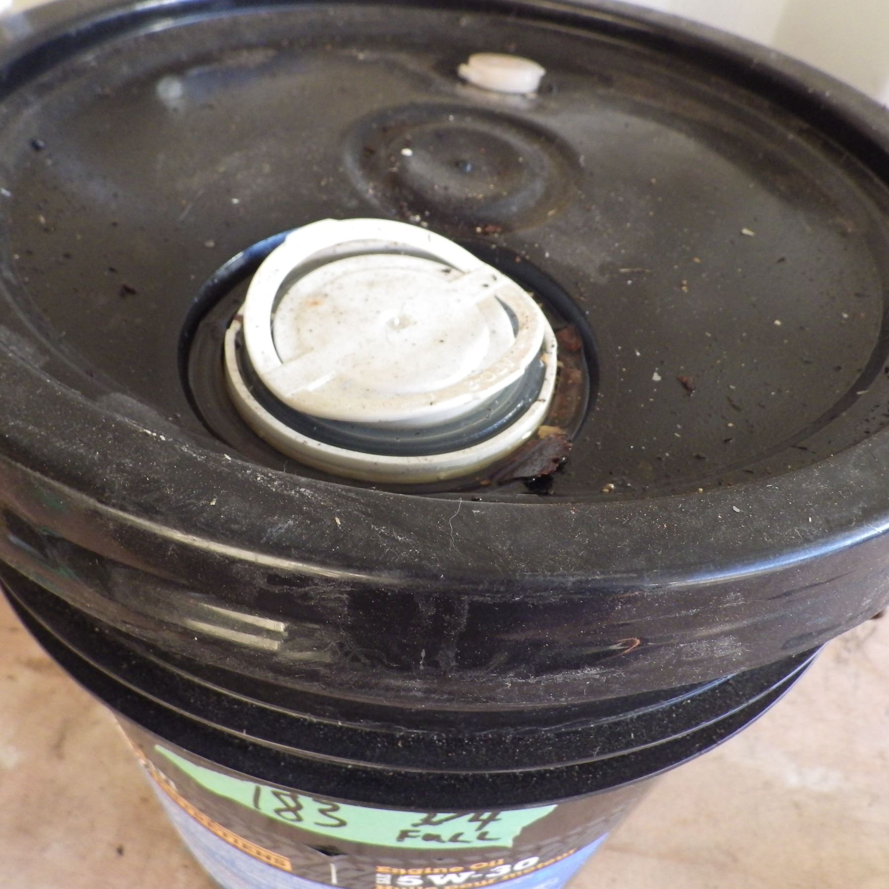 Pail approximately three quarters full of 5 W - 30 engine oil