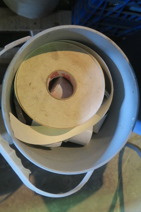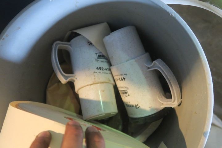 Pail of Misc Items Including Drywall Tape and Coffee Mugs