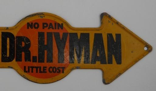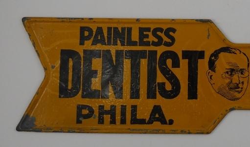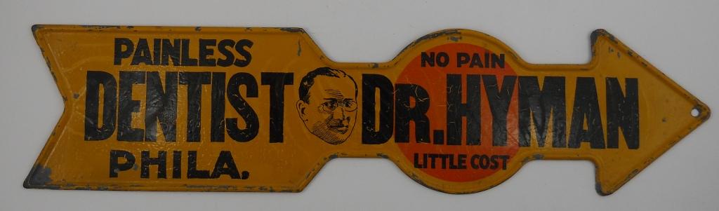 This is a three-color die-cut pressed steel sign that reads "Painless Dentist Dr. Hyman, No Pain, Little Cost, Philadelphia". There is also a picture of the dentist in the center.