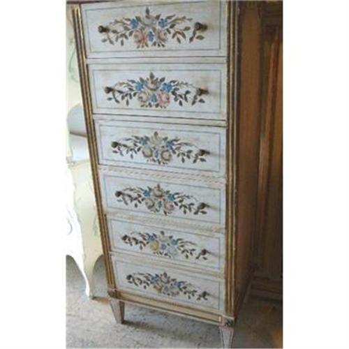 This is a wonderful hand painted lingerie chest with six drawers. The painted decoration is a floral design in pastel colors with gold accents at the edges of the piece. This is a great find!!!