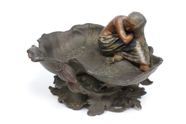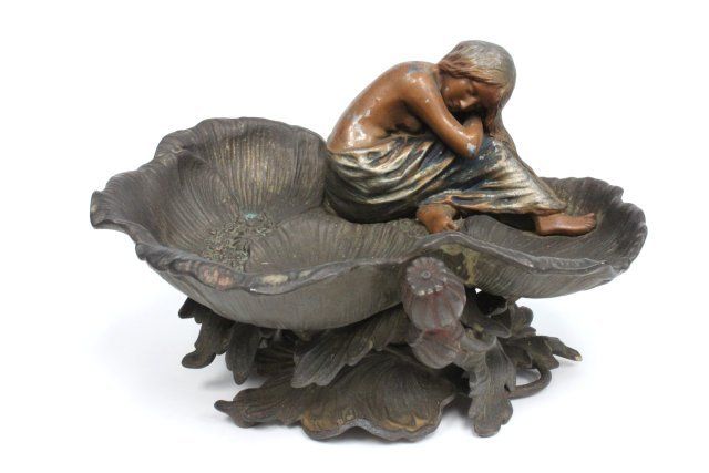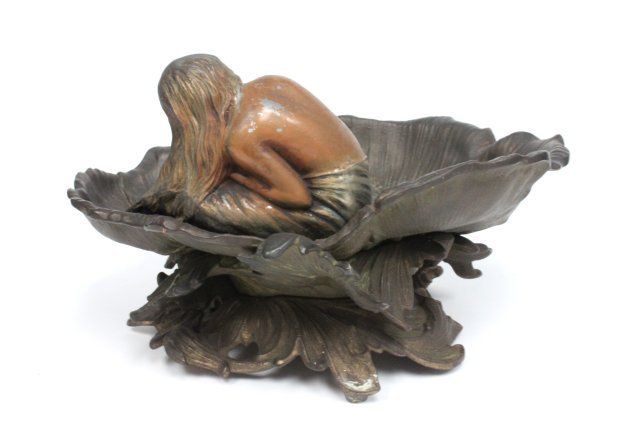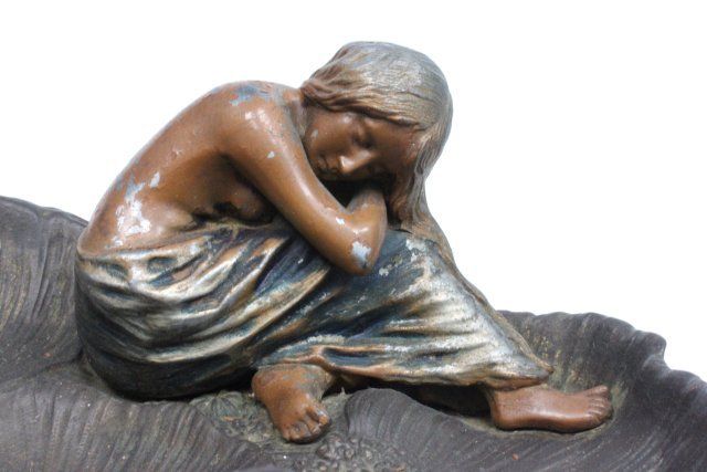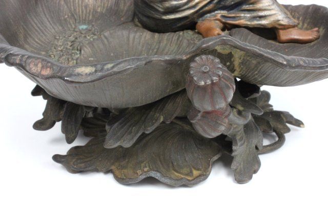 Depicting 'Semi-Nude Girl Sitting on Flower'. Footed. Approx. 6" H. X 9.5" W.