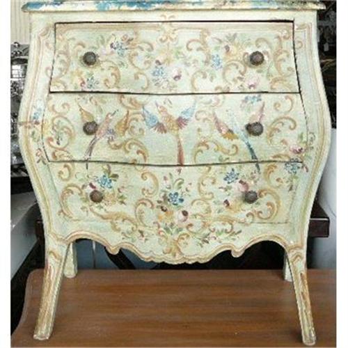 This is an exquisite paint decorated polychromed bombe' nightstand commode having three drawers and decorated with birds, flowers and scrolls...a really beautiful piece!!!