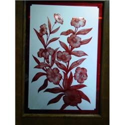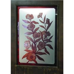 31 1/4" high and 21" wide, Painted/stained glass door panel (Bohemian?), frosted & engraved in red floral design, with subtle gradations of color. Raised 5-petal flowerheads with leaves & stems; elegant red glass border has floral corner engravings. Still mounted in an unremarkable door