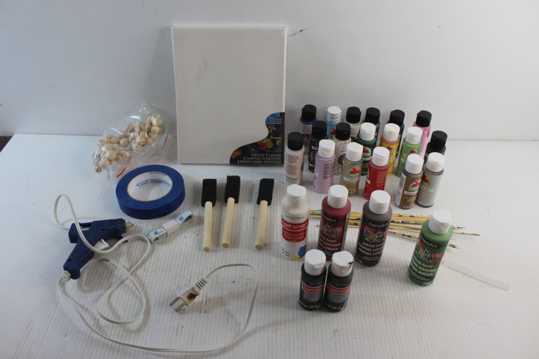 Paint Testing Sticks, Acrylic Paints, Glue Gun. Paper Tape, Sponge Brushes and Artist Canvas 8'' x 1
