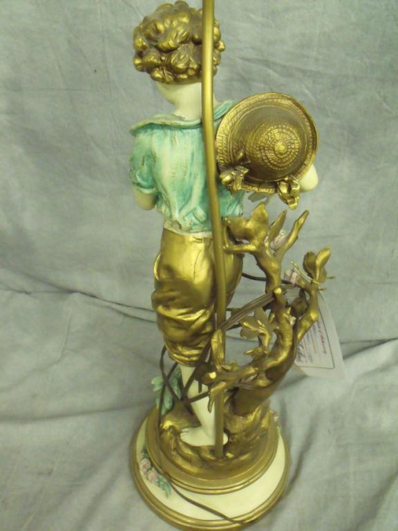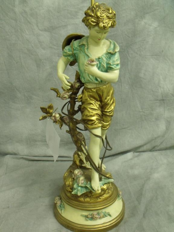 Beautifully French Regency style painted bronze lamp. Made after original statue by LF Moreau, cast by Collection Francaise. After sculpture "La Paysen" depicting a young man picking flowers. 43" tall missing shade otherwise in near new