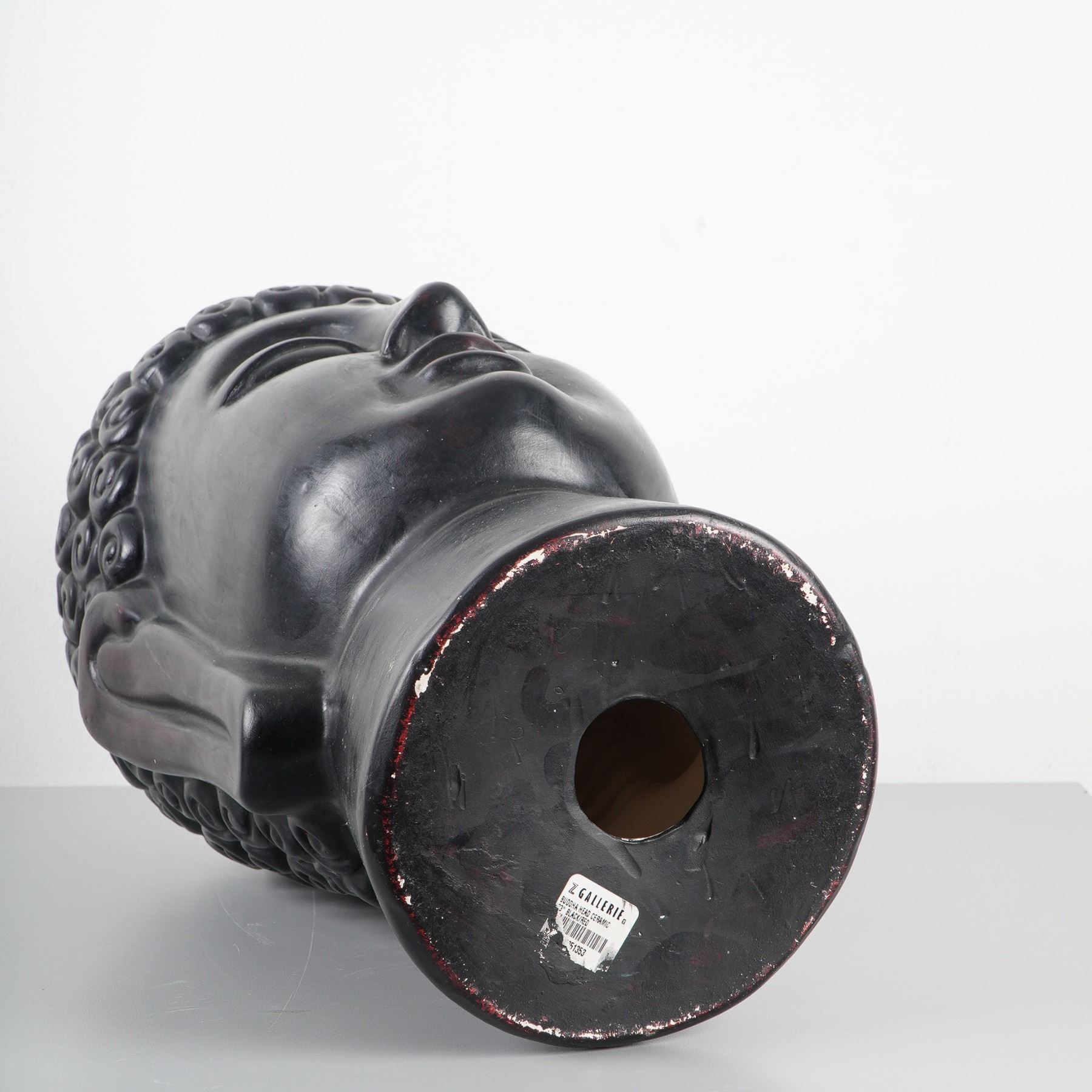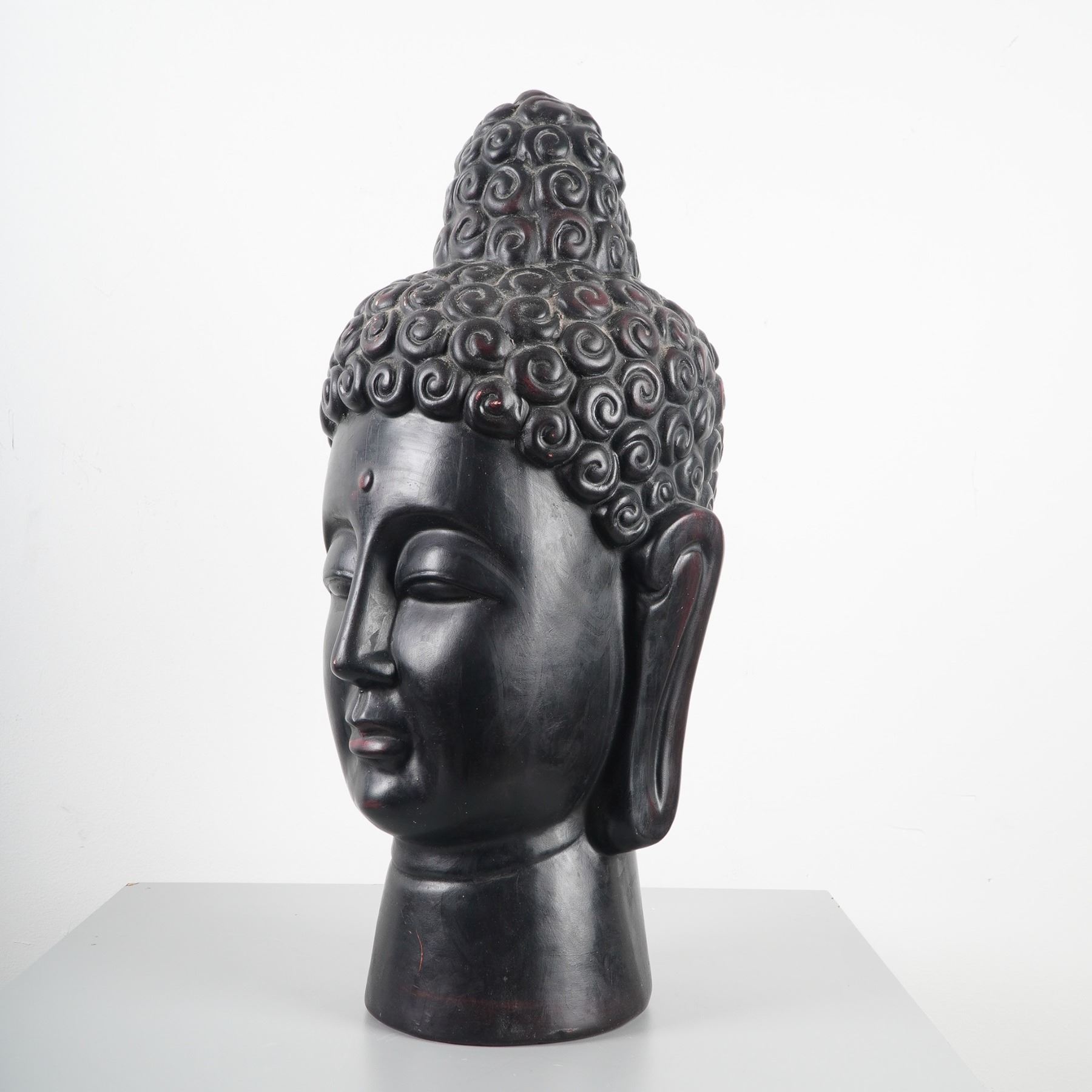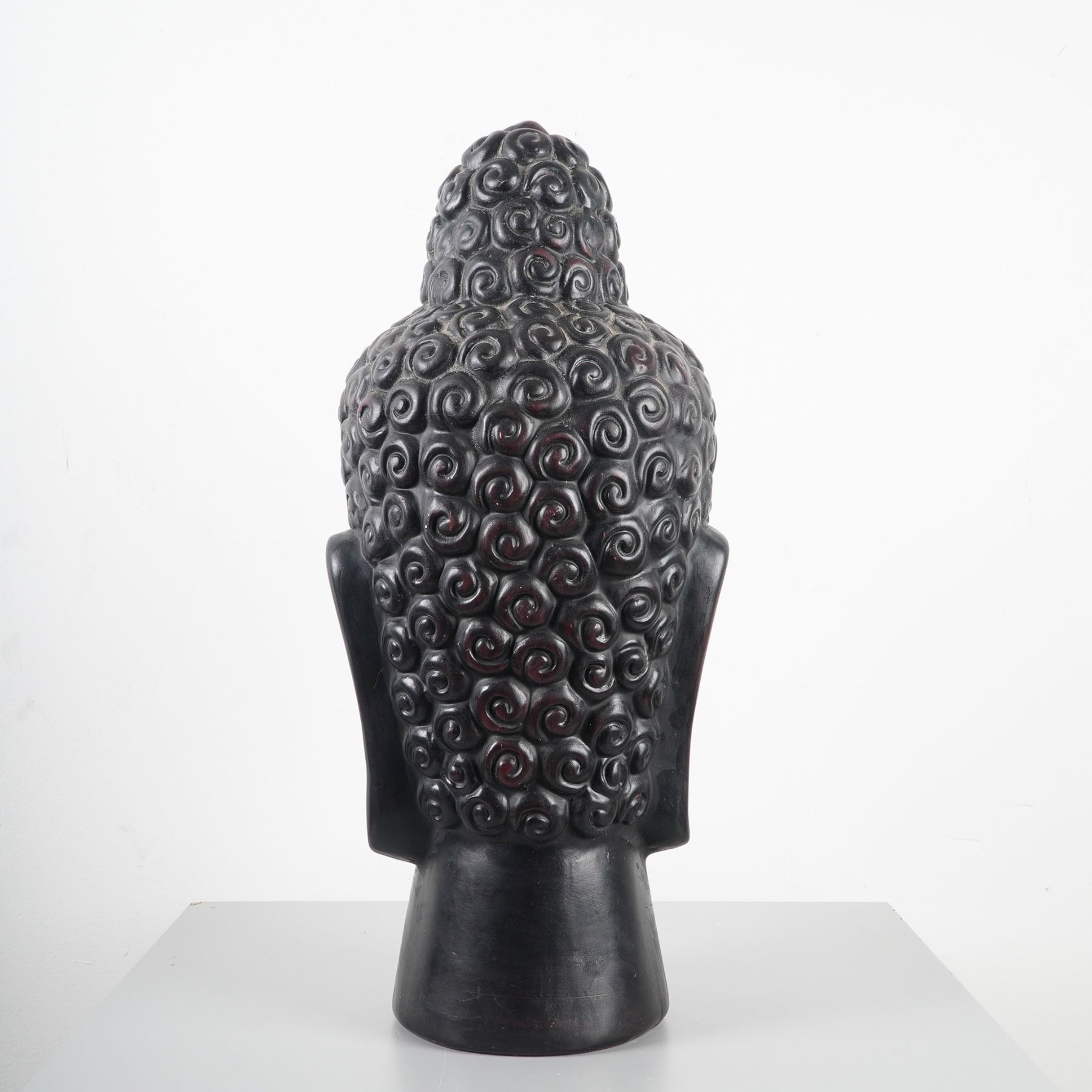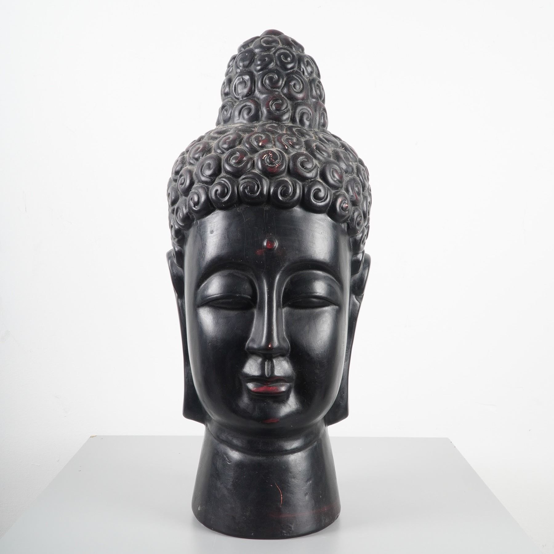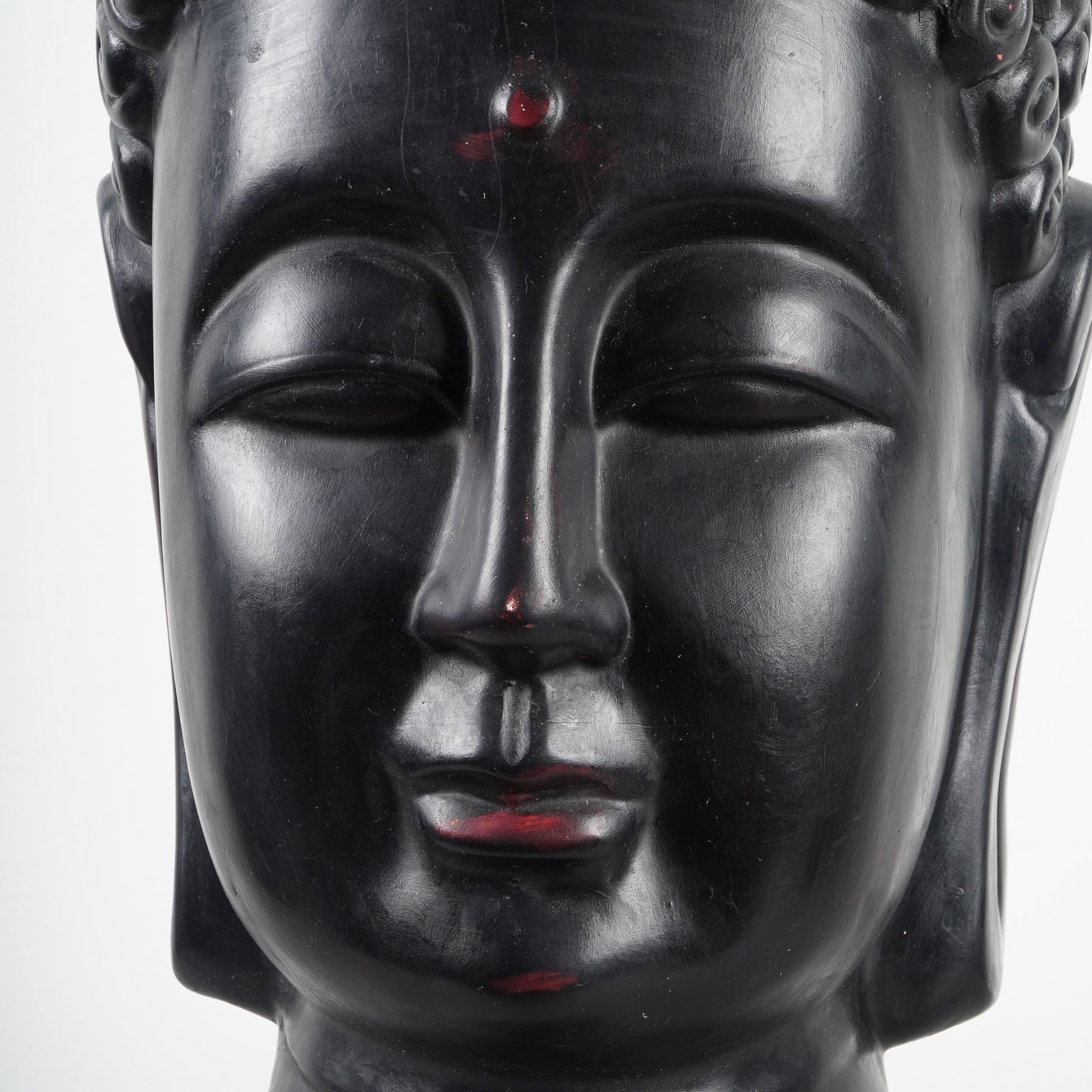 Striking painted metal sculpture of a Buddha head with smooth black finish and subtle red color accents on the lips, urna, and hair curls. The figure is modeled in a calm, meditative expression with finely sculpted features and coiled hair motif, evoking traditional Buddhist iconography. The base is open and bears a partial label from Z Gallerie, a retailer known for decorative global-inspired home furnishings. Housed in a rounded, tapering pedestal-style neck, this sculpture is a bold and serene presence for any interior space.