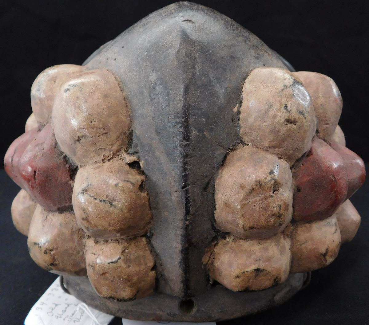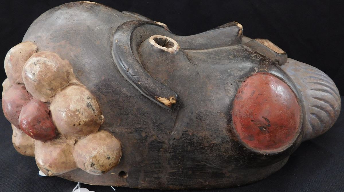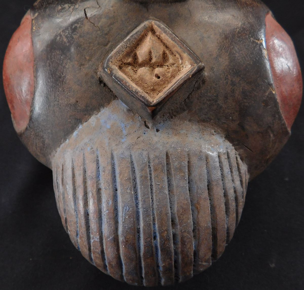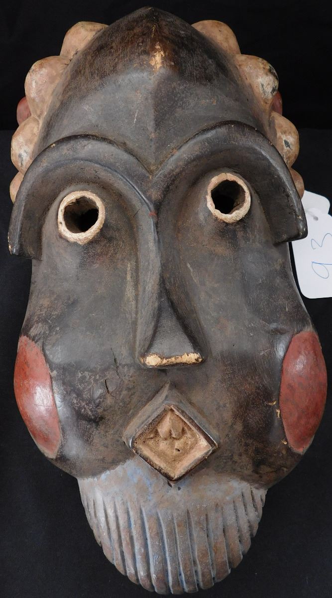 Painted & Carved African Wood Mask, circa 1920s. Item measures 13" x 7" x 6" and is made of wod and paint, with a metal wire for hanging. From Cameroon, Tikar tribe, Africa. Note the pursed lips, red cheeks and interesting hairdo. Mask is polished on the inside from use. Condition: Very good, see images. Shipping: $20.00