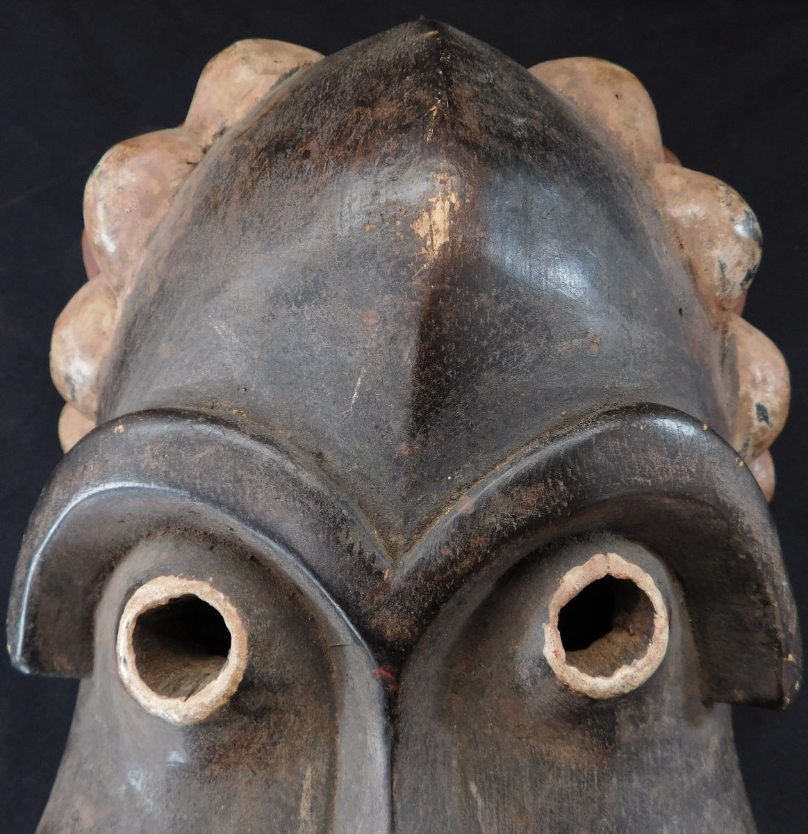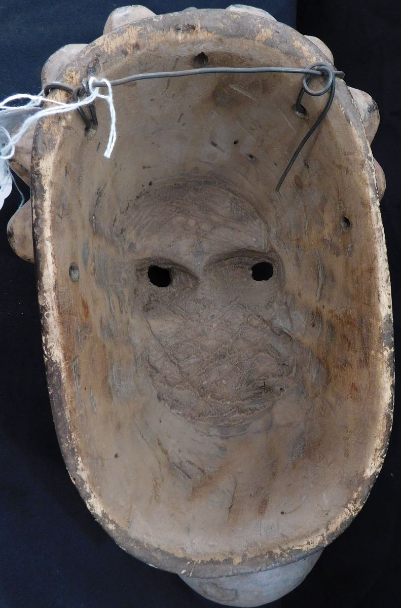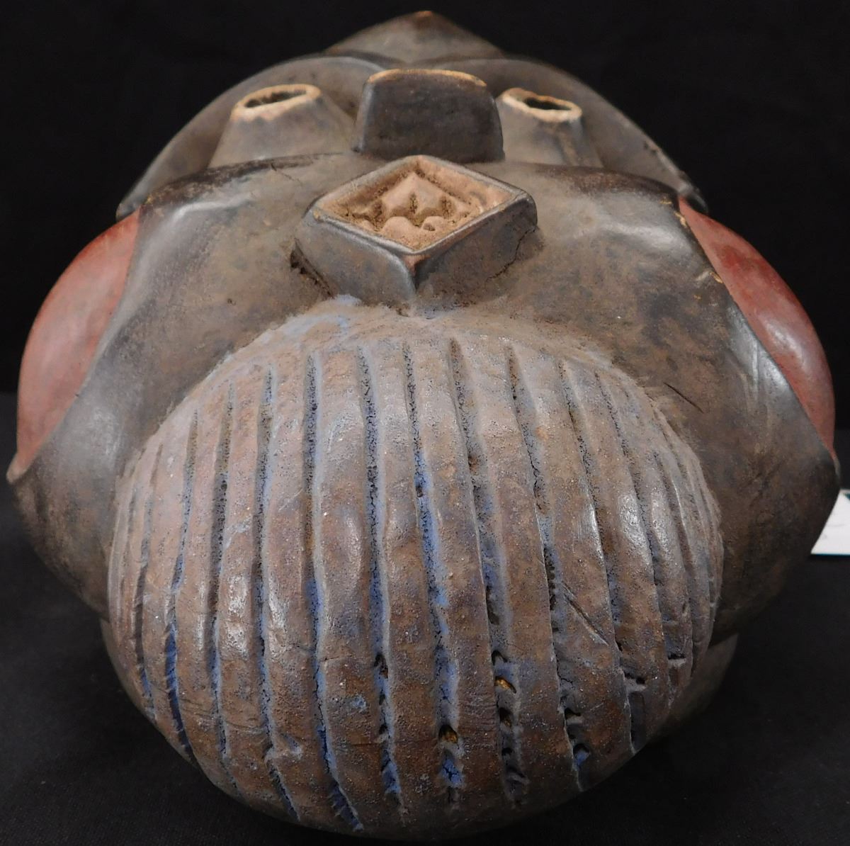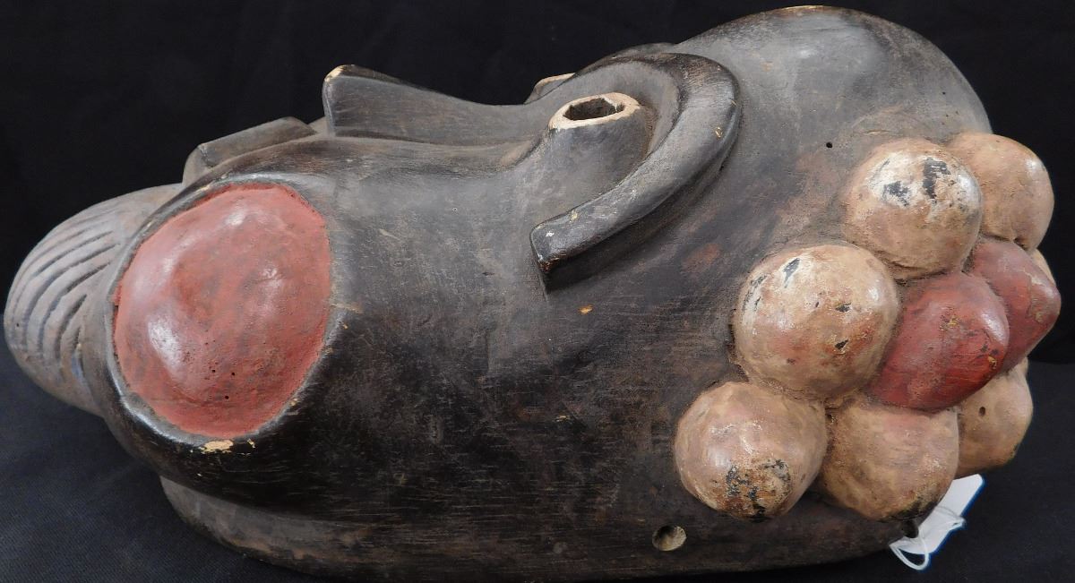 Painted & Carved African Wood Mask, circa 1920s. Item measures 13" x 7" x 6" and is made of wod and paint, with a metal wire for hanging. From Cameroon, Tikar tribe, Africa. Note the pursed lips, red cheeks and interesting hairdo. Mask is polished on the inside from use. Condition: Very good, see images. Shipping: $20.00