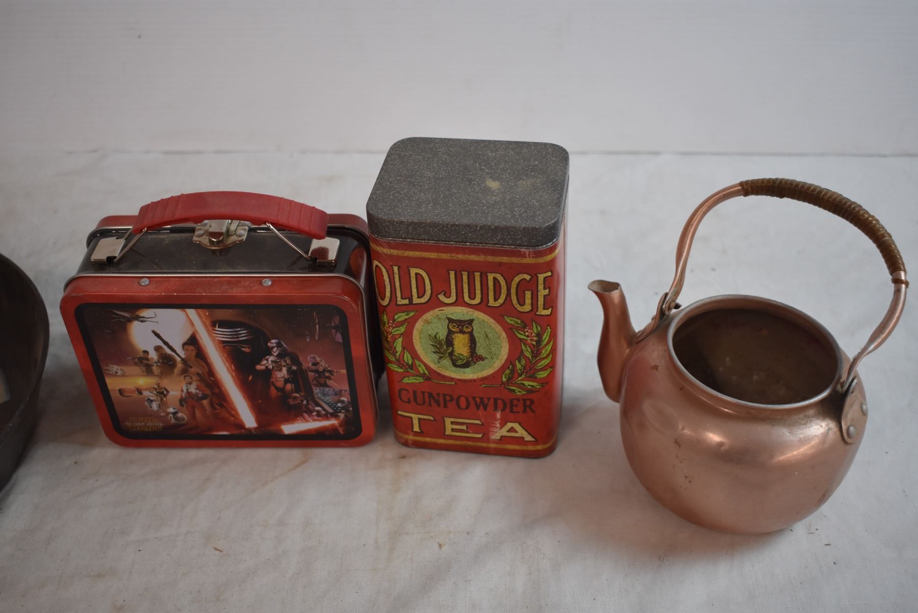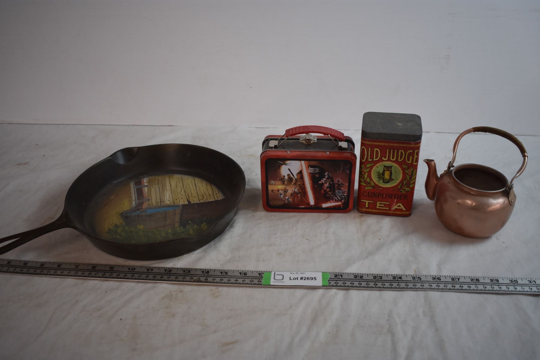 Painted Cast Iron Pan, Mini Star Wars Lunchbox, Repro Tea Tin, and Copper Kettle