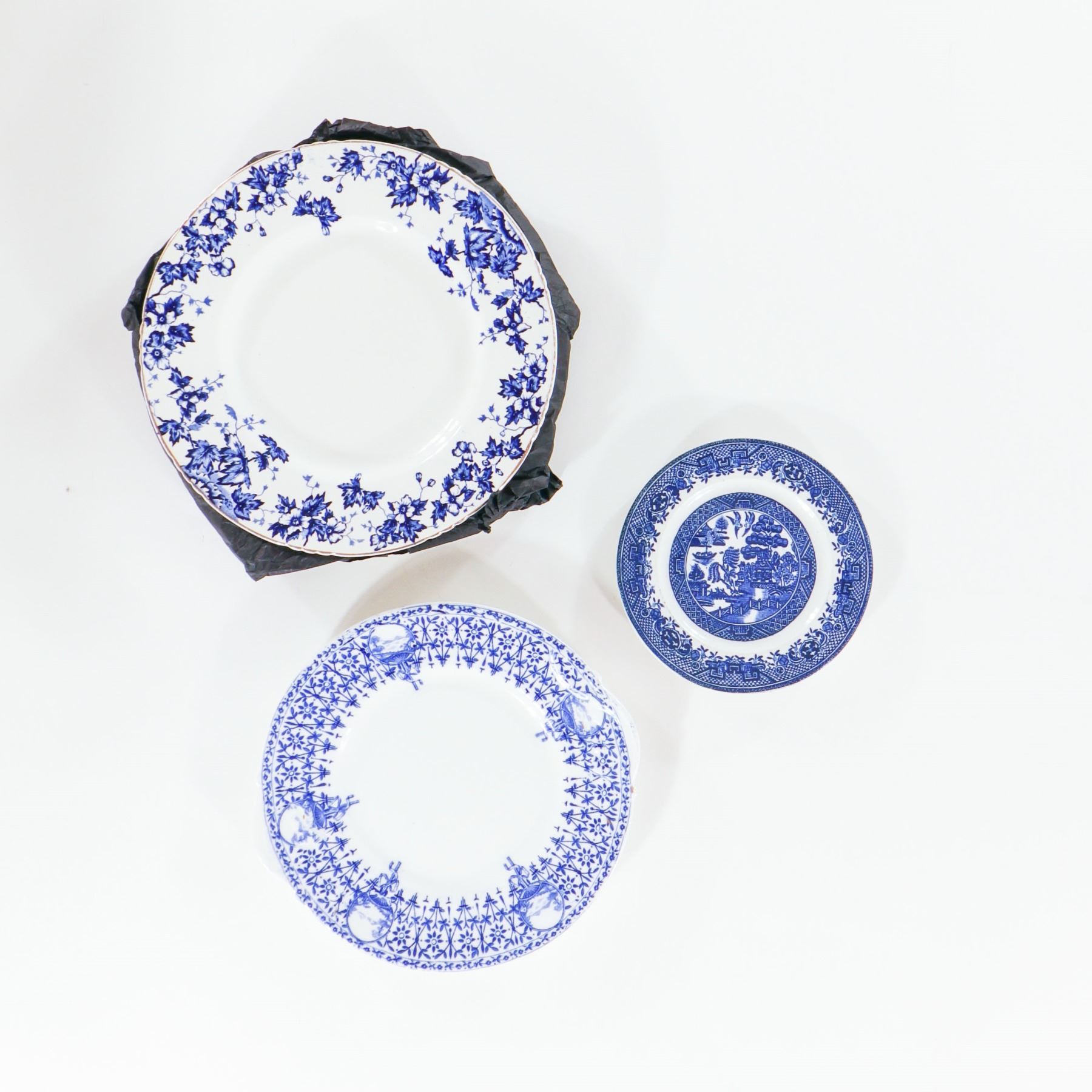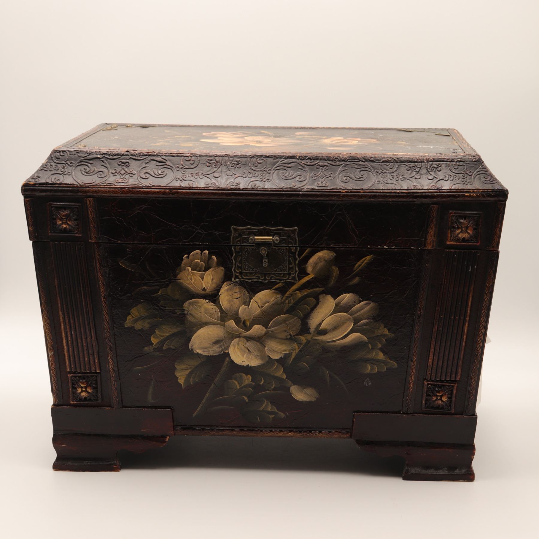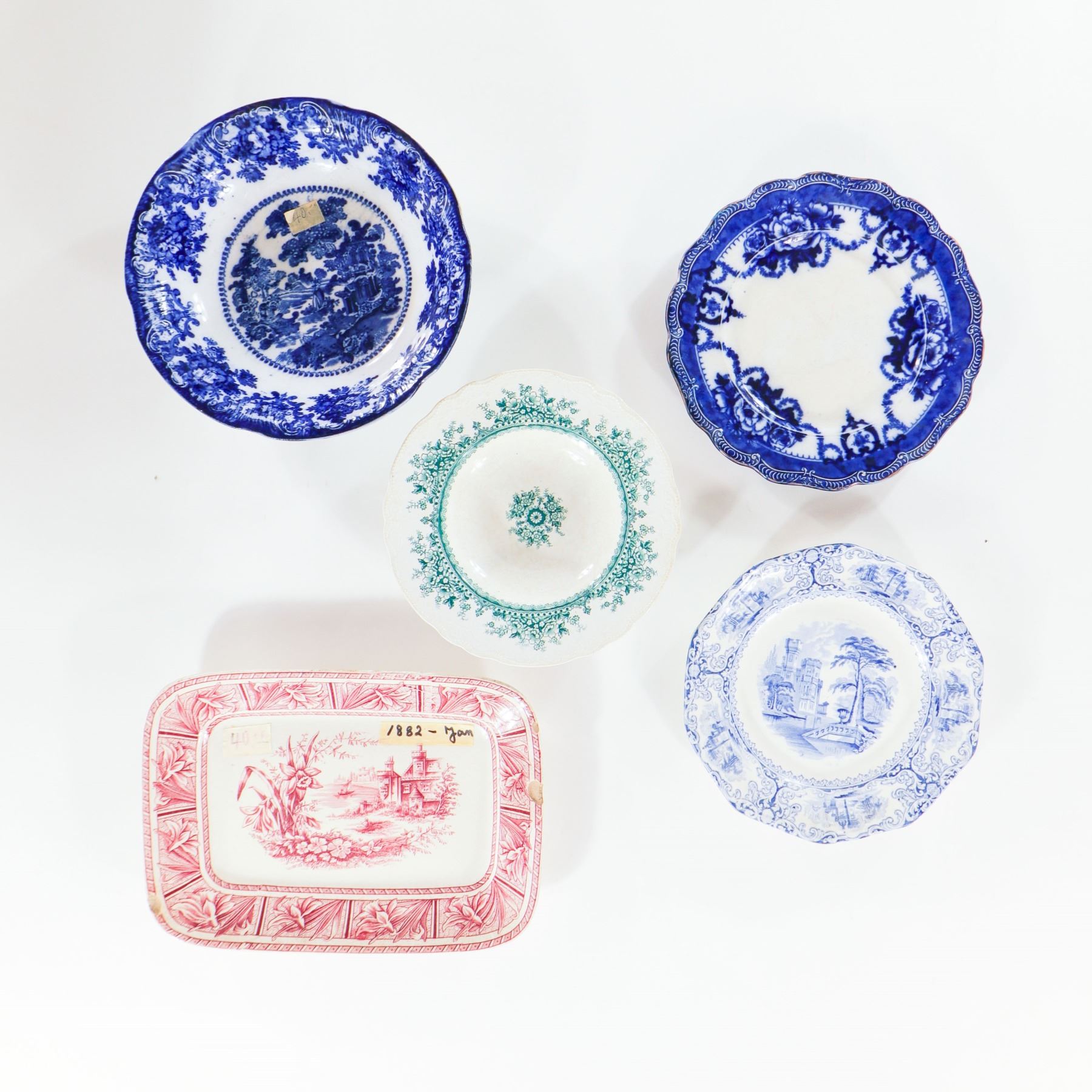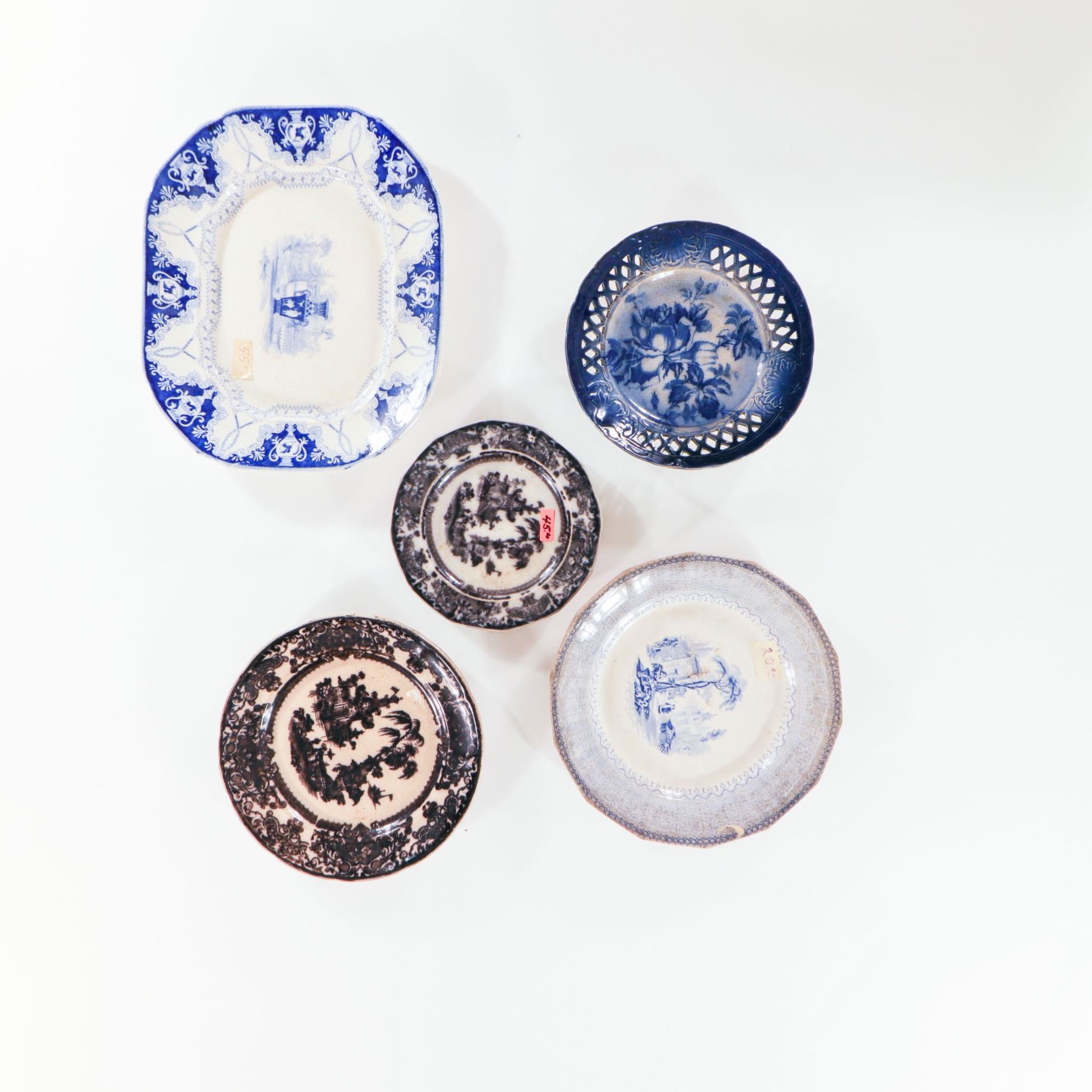 Comprising a dark-stained wooden storage chest with hinged lid, relief-carved borders and applied floral carving, the front and top painted with large cream blossoms against a deep brown ground, raised on bracket feet with a small brass lock escutcheon; together with a mixed group of thirteen 19th–early 20th century English transfer-printed earthenware plates and dishes. The ceramic group includes: several blue transfer pieces with romantic landscapes and floral borders, a small “Willow” pattern plate, two mulberry/black transfer plates with figural scenes, pierced-rim blue plate, two flow-blue bowls with scrolling borders, a green transfer-printed bowl, and a pink/red aesthetic rectangular dish inscribed “1882” in ink, along with other floral and scenic patterns. Most with molded rims and typical Staffordshire bodies in various colour palettes—blue, black/mulberry, green and red. An appealing study lot for the transferware collector, sold together with the decorative painted chest in which they were found.