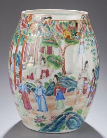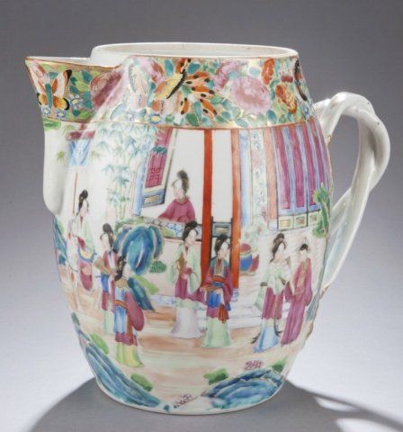 A Chinese painted porcelain cider jug with courtesan scene. c. 1850. Gilt painted accents throughout. 9"h x 10 1/2"w.