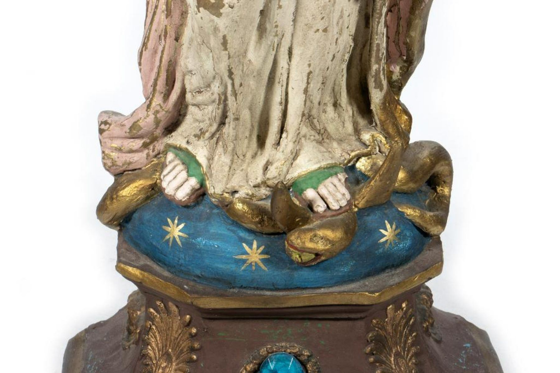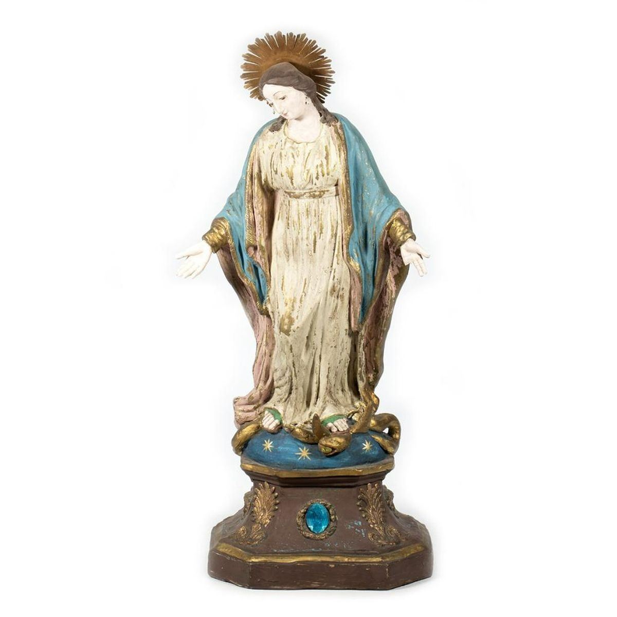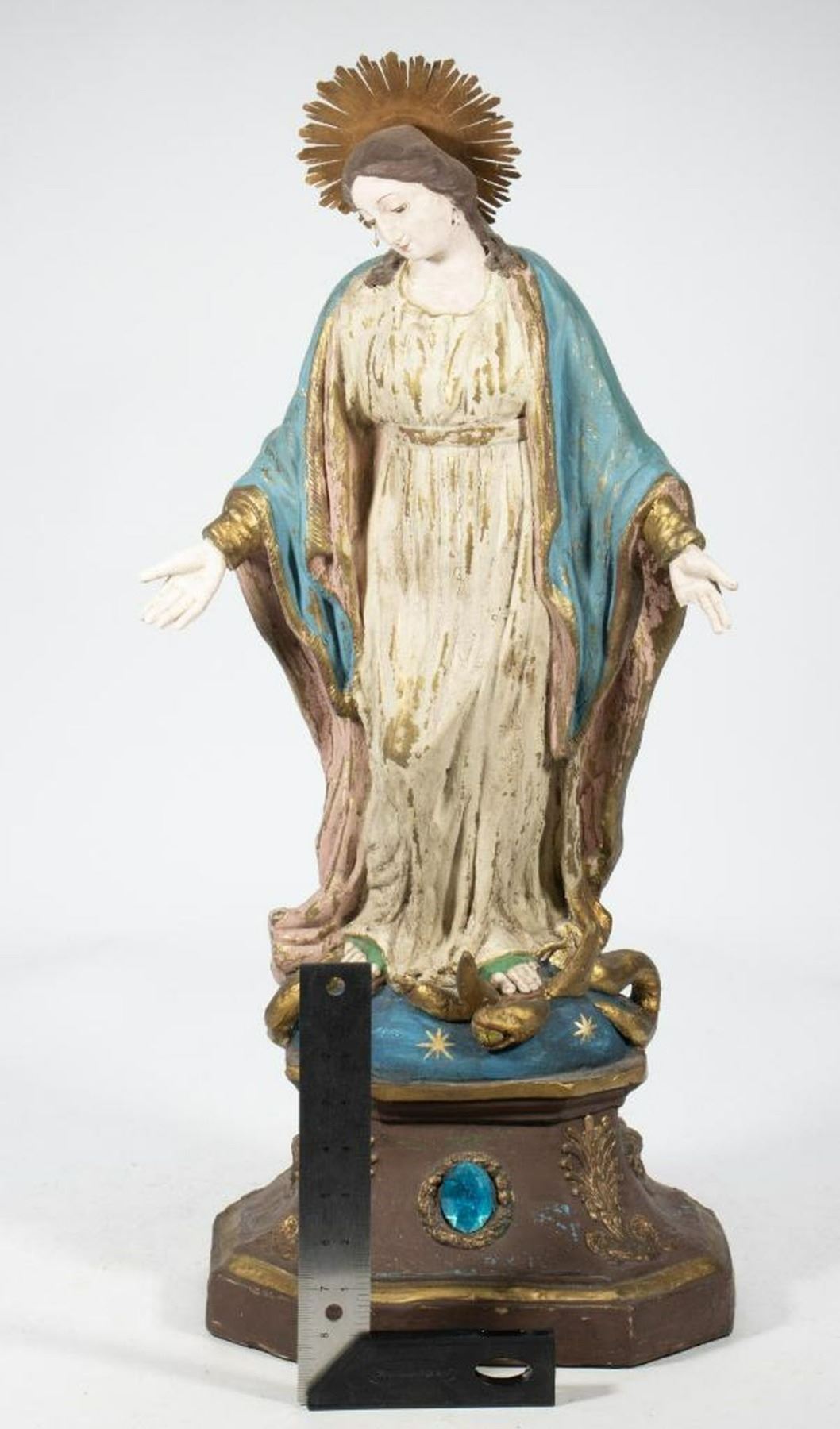 The figure with glass eyes, her feet treading on a serpent upon an integral base that is embellished with a blue "jewel." 28 h. x 13in. w. x 7in. d. Condition: Possibly with paint repairs; two fingers missing from one hand.