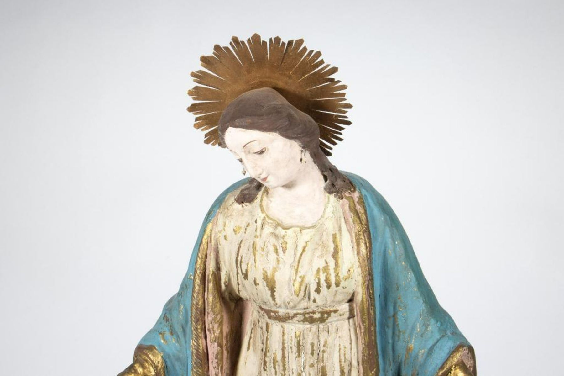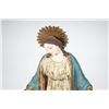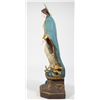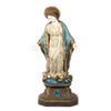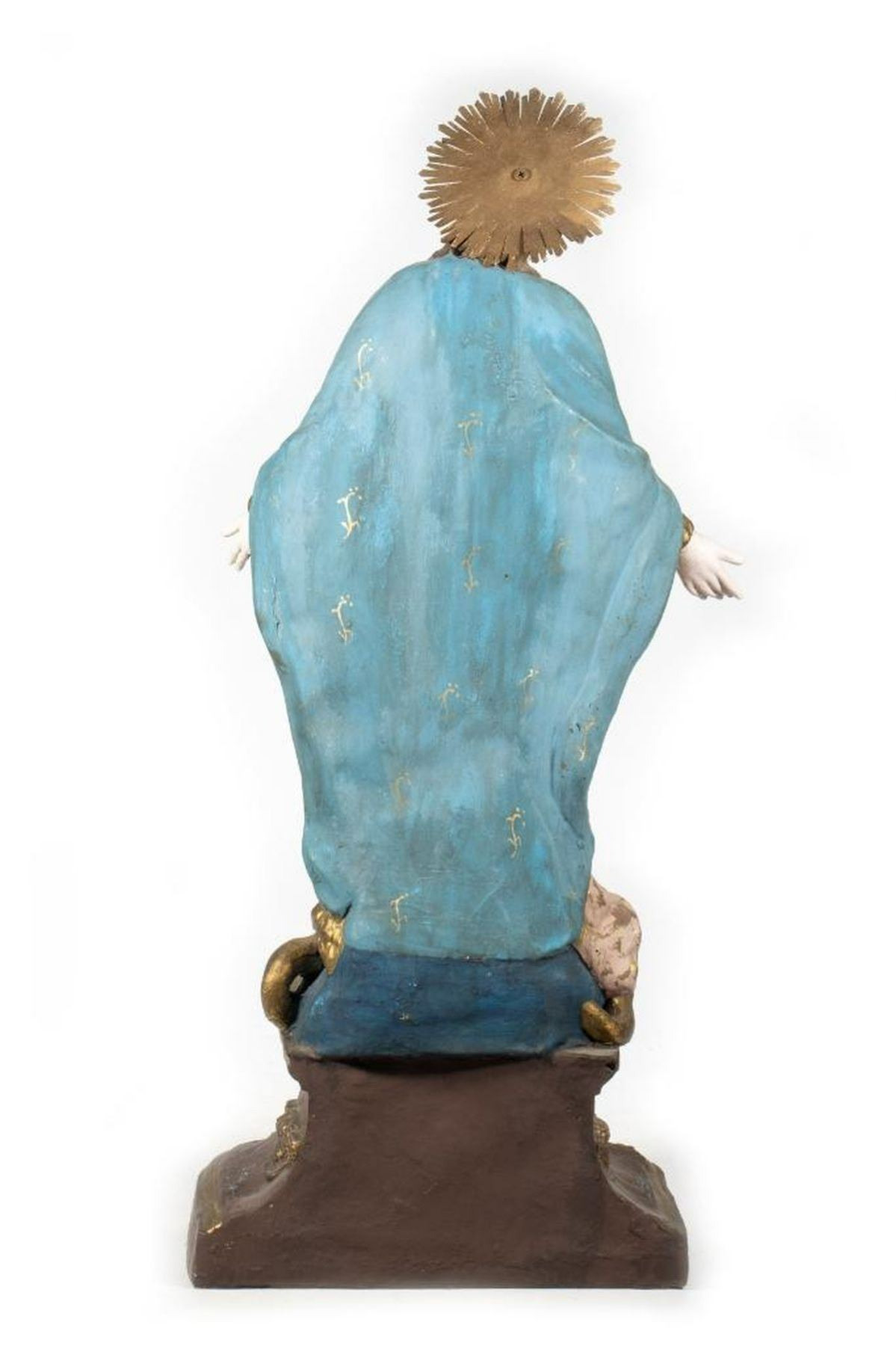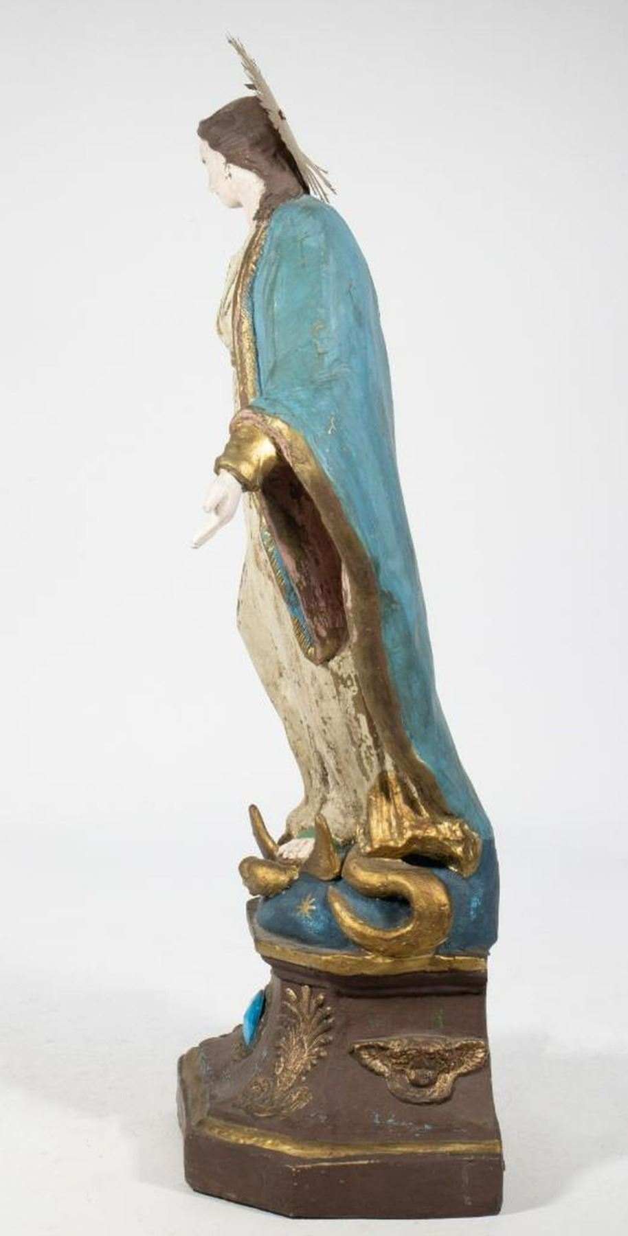 The figure with glass eyes, her feet treading on a serpent upon an integral base that is embellished with a blue "jewel." 28 h. x 13in. w. x 7in. d. Condition: Possibly with paint repairs; two fingers missing from one hand.
