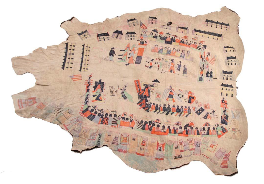 Painted Cowhide. 79" x 61". Sioux Indian designs of Fort Laramie. (est $3,000-4,000). For condition reports please visit: www.auctioninsantafe.com/cr2011.pdf