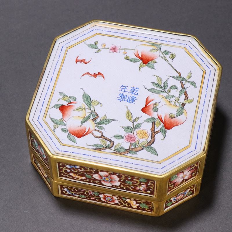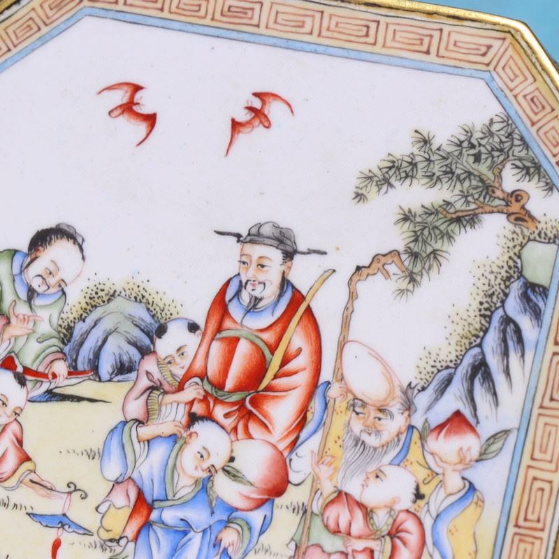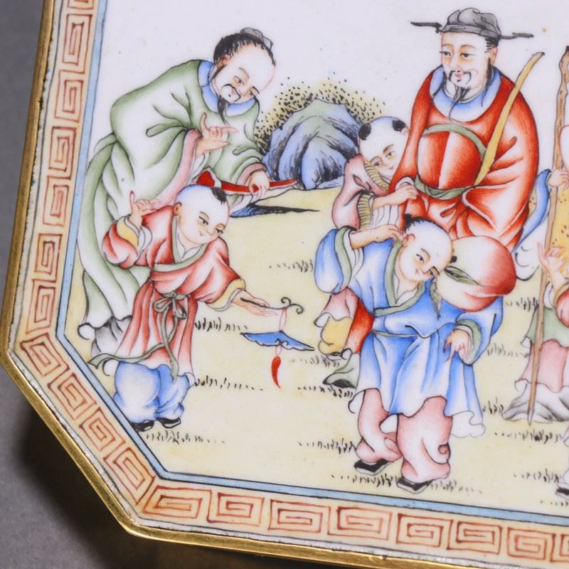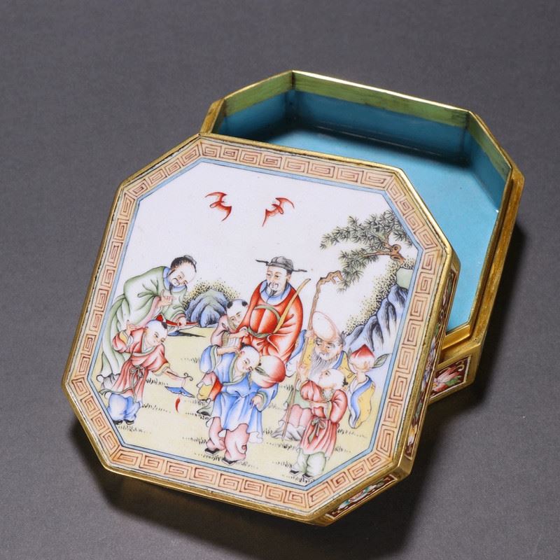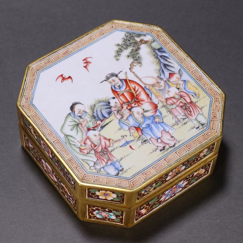 This box is crafted on a copper body and decorated with painted enamel. The cover depicts a lively figural scene in vibrant colors, full of narrative charm. Floral motifs adorn the sides, creating an elegant composition with both artistic and ornamental value.