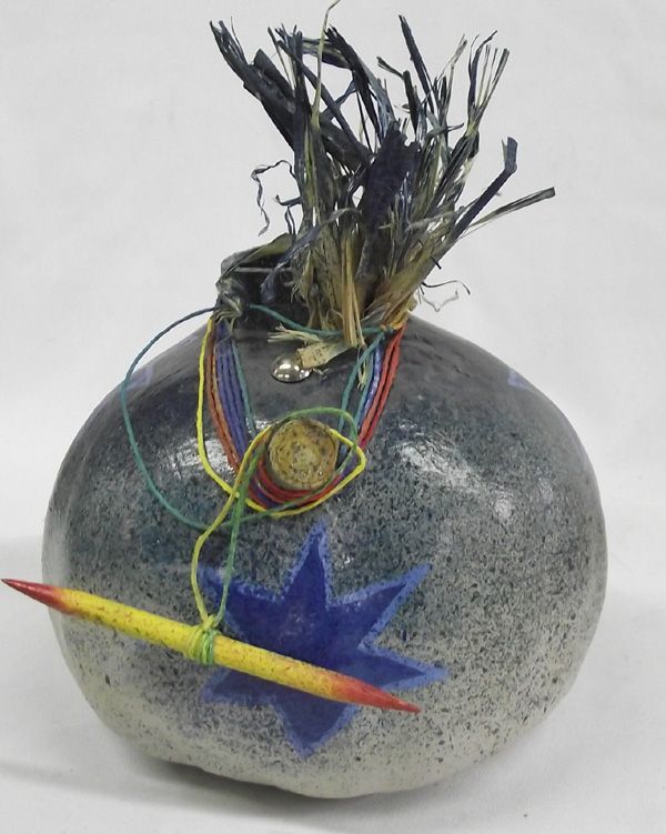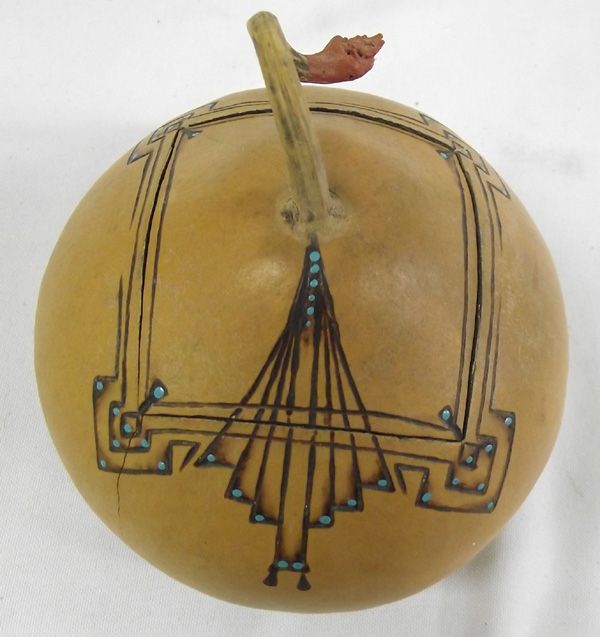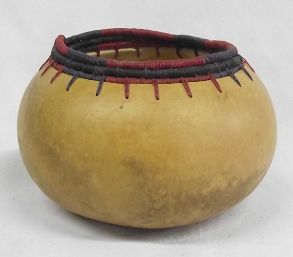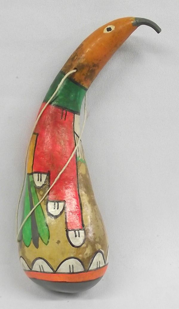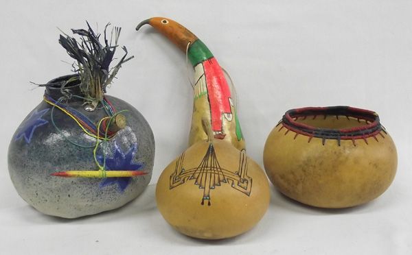 4 Painted Gourds. This collection includes a colorful hummingbird gourd, a bowl gourd with decorative twine trim around the rim, another bowl gourd with a cutout lid and incised lines around the top and a large blue gourd with paint, twine and rafia decor. It measures 9.5''H x 6.75''W.