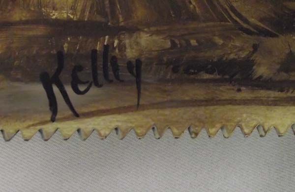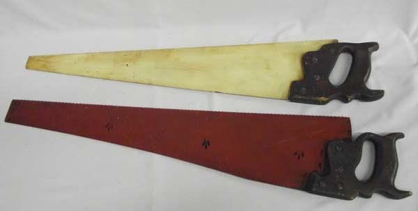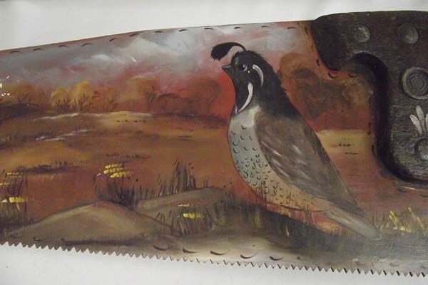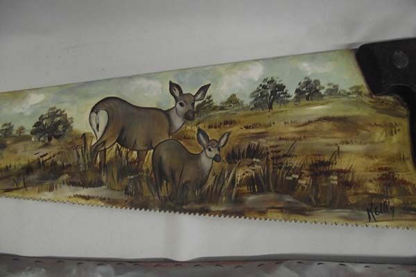 Painted Hand Saws. Two hand saw blades, one has a quail and meadow scene painted on it and the other has a deer and its fawn painted on it. The other side of each blade is painted with a solid color. the quail scene is the largest saw and measures 30''L x 6.25''W. Each blade is signed, ''Kelley.''