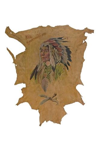 Painted Indian on Hide. 45" x 39". "Kill Spotted Horse". Unsigned. Typically done between 1890-1910. (est $1,000-2,000). Provenance: MAC Museum, Spokane, Washington.