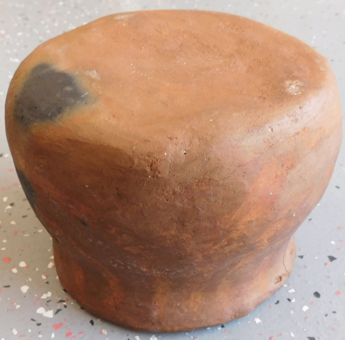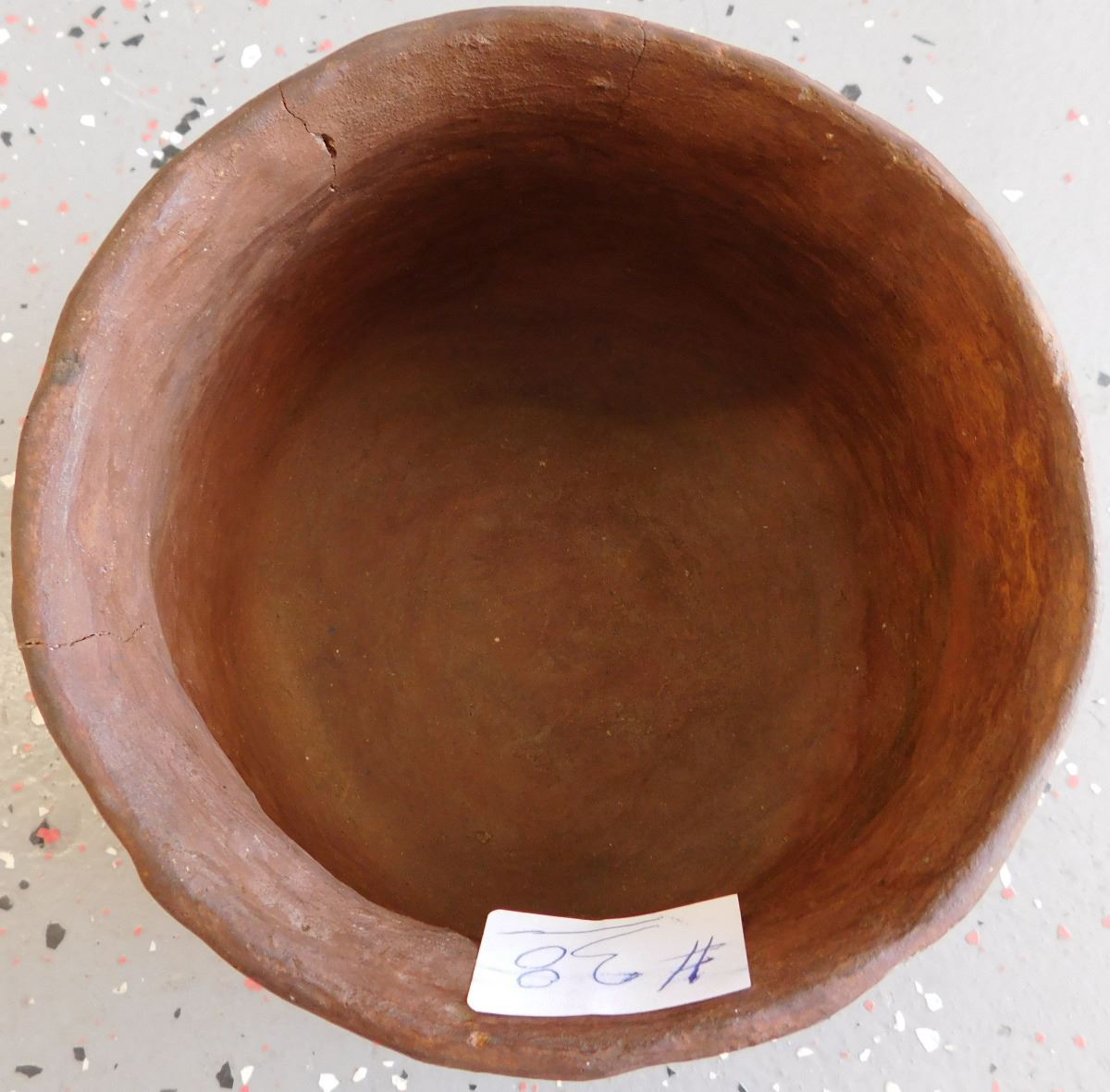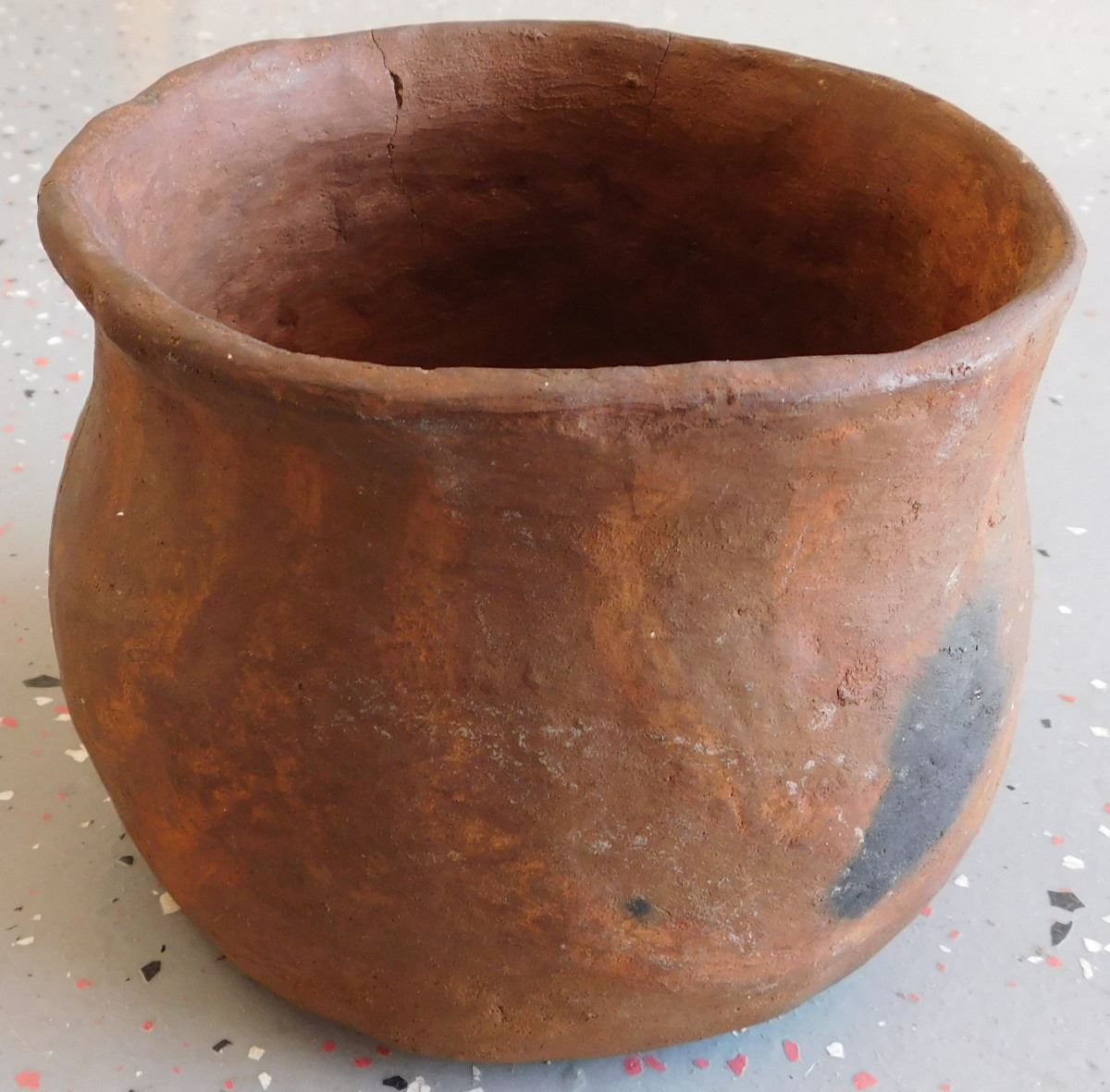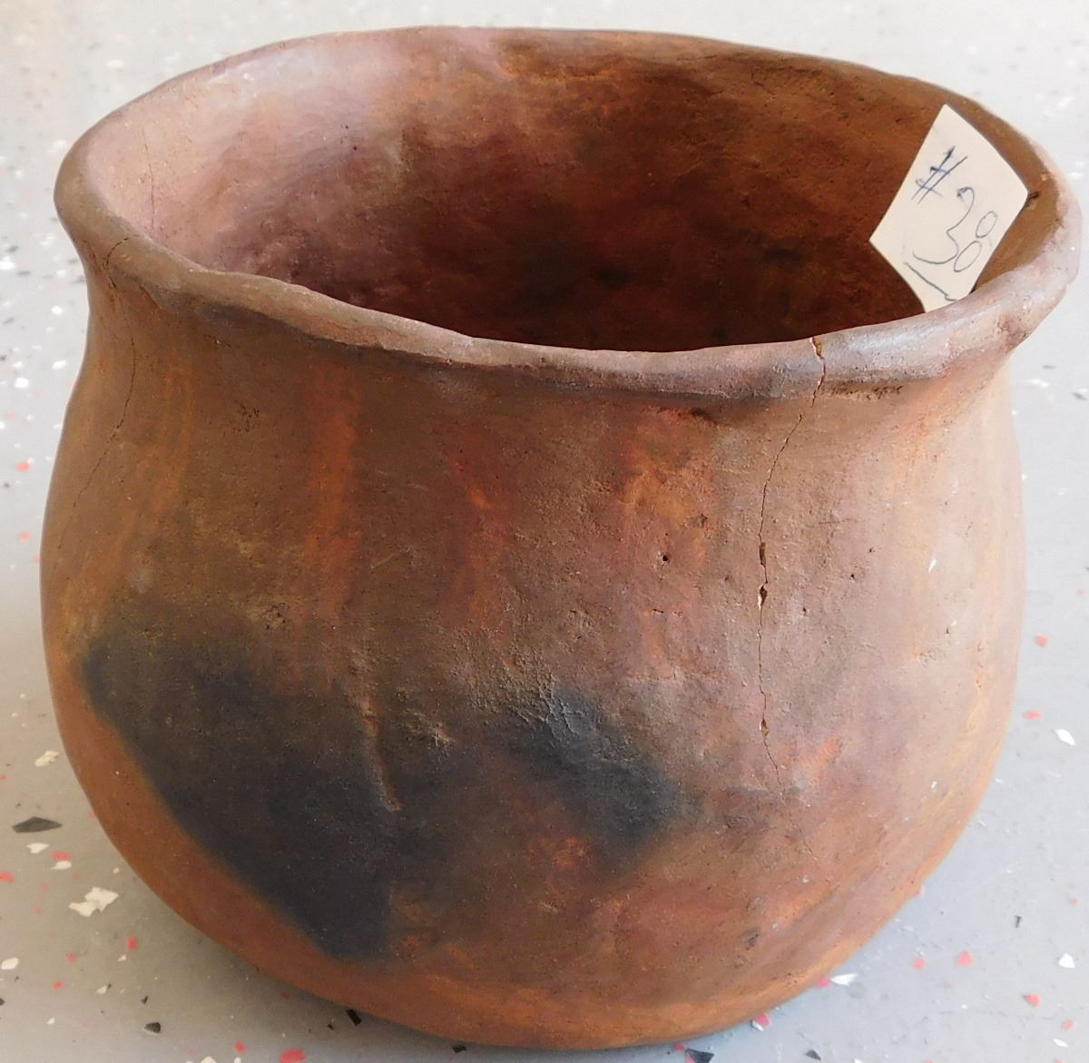 Painted Mission Olla, circa 1920s. Made of clay and iron oxide paint, this item is 6" x 5". From San Diego County, found in Ramona, CA. Has classic "U" shaped design painted on it. Condition: Has hairline cracks, see images. Shipping: $30.00, requires double box.