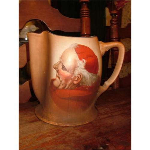 This beautiful antique ceramic porcelain pouring pitcher is eligibly signed with what looks possibly like (M) or (O) or (T) as the first letter then (okie) then (J)..(K). We have looked at the inscription which is signed - not printed. This transfer pitcher has a Friar who is quite jovial facing the pour spout as seen in the close-ups. Fair condition due to one crack which is seen from the inside clearly and less clearly from the outside. There has been no repair to this area to my knowledge. This pitcher is little over 7 inches (18 cm) in height and 9 inches (23 cm) spout to handle. I purchased this antique as you see it now. Turned facing the viewer, there appears to be little damage approximate to the Friar's placement. The base is white but I darkened it significantly to pull up the writing on the base. We will pack this pitcher to assist safe shipping but insurance is still necessary since porcelain is vulnerable.