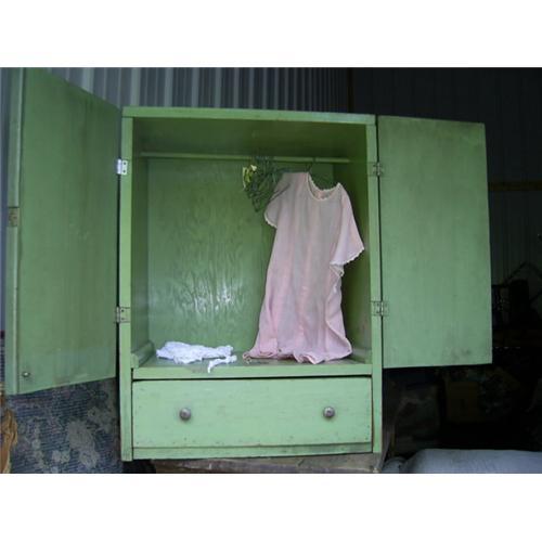 An apple green childs play wardrobe closet in excellent antique condition. There two doors, one that latches inside just like the big closets and a bottom drawer. Included are ten zinc hangers and a homespun doll dress.