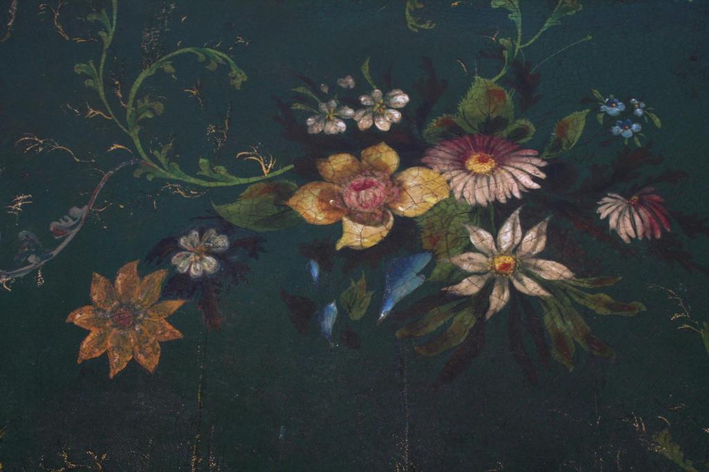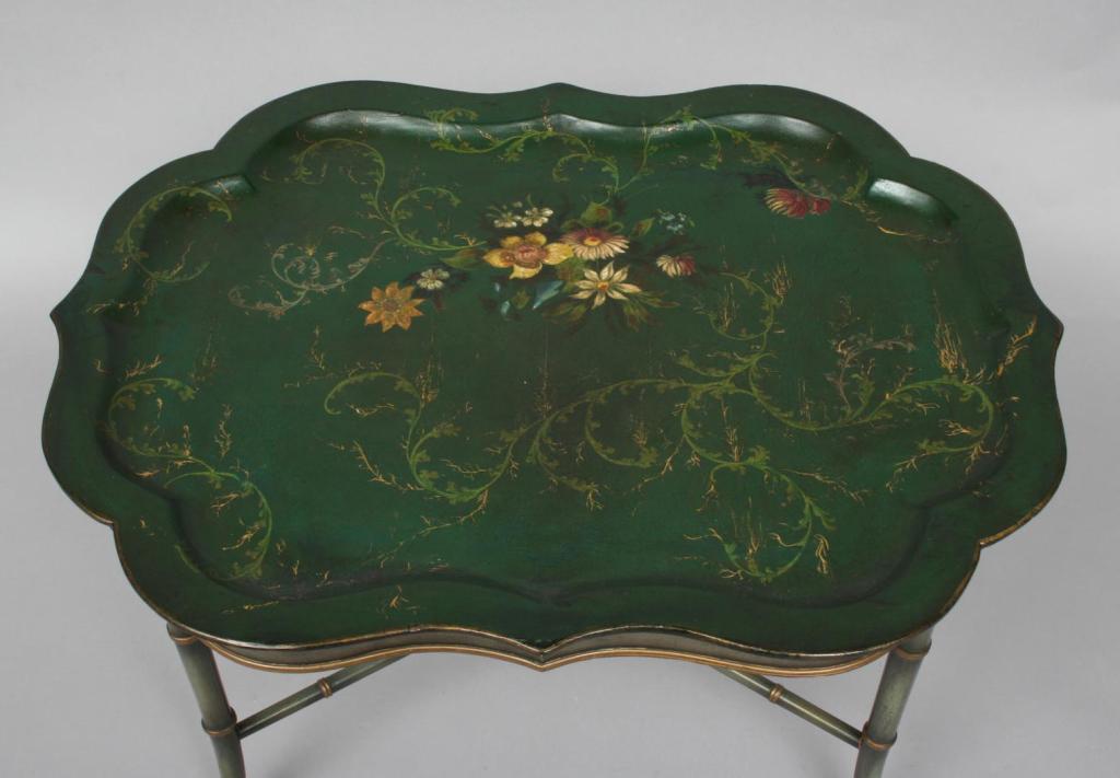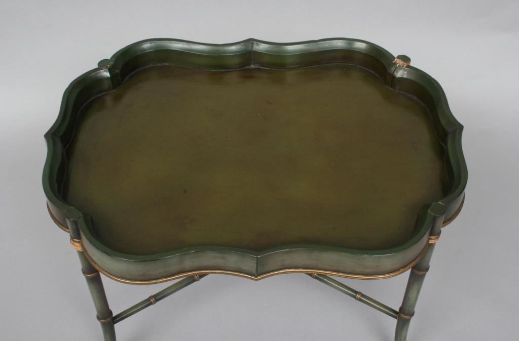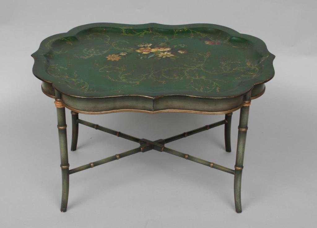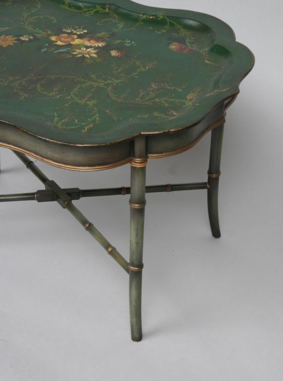 The lobed form painted in polychrome with stylized floral motif on a green ground, raised on a bamboo motif base similarly painted in green, the details gilt. 18"H. 31"W. 23"D. Condition: some light wear and losses, including light scuffs, light scratches to tray table and base, base with loose joints and old repair, generally very good.